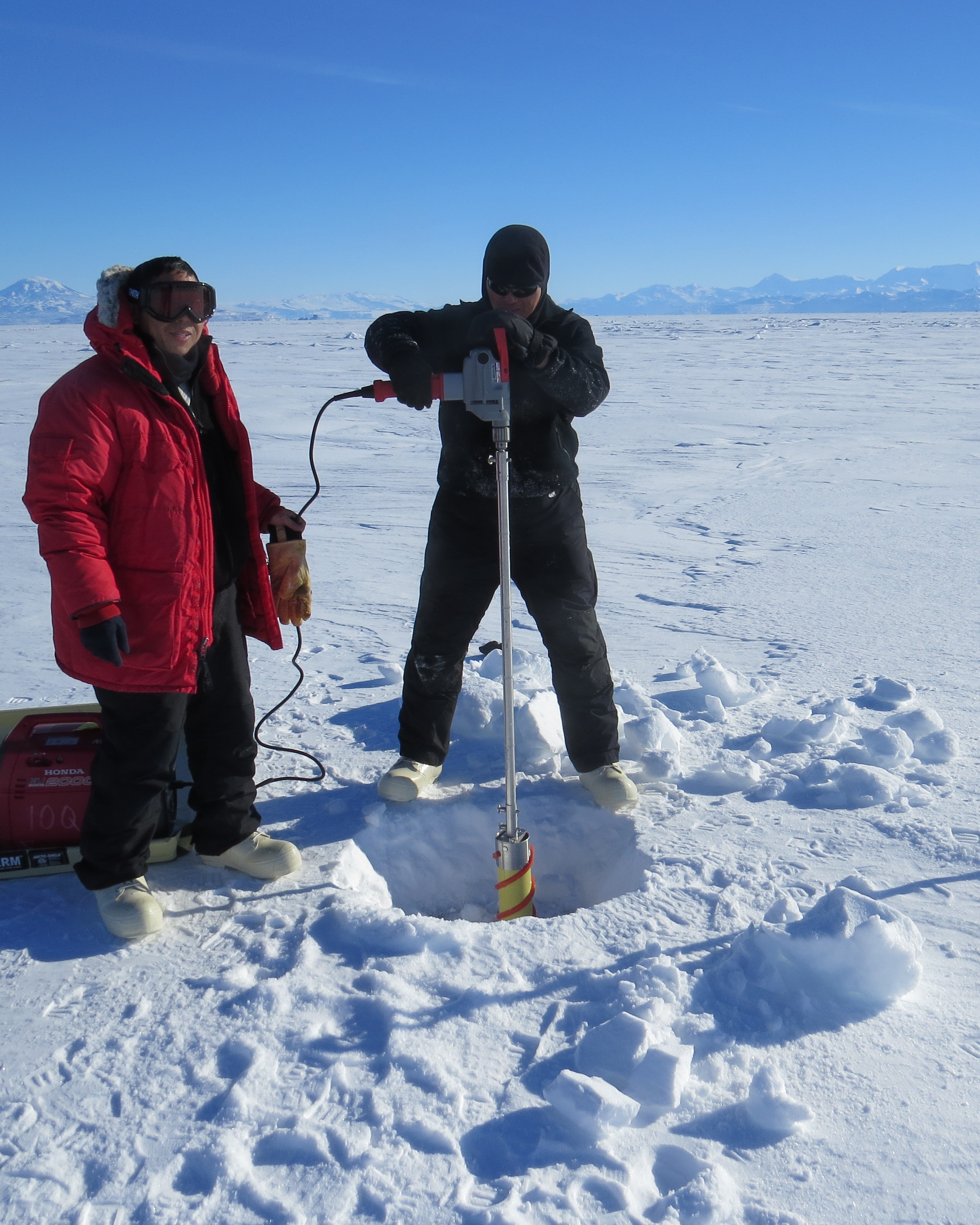 Yongli Gao uses the power drill to core a deep section of ice. Hongjie Xie keeps the cord from getting caught in the corer. On the sea ice of the Ross Sea, Antarctica.