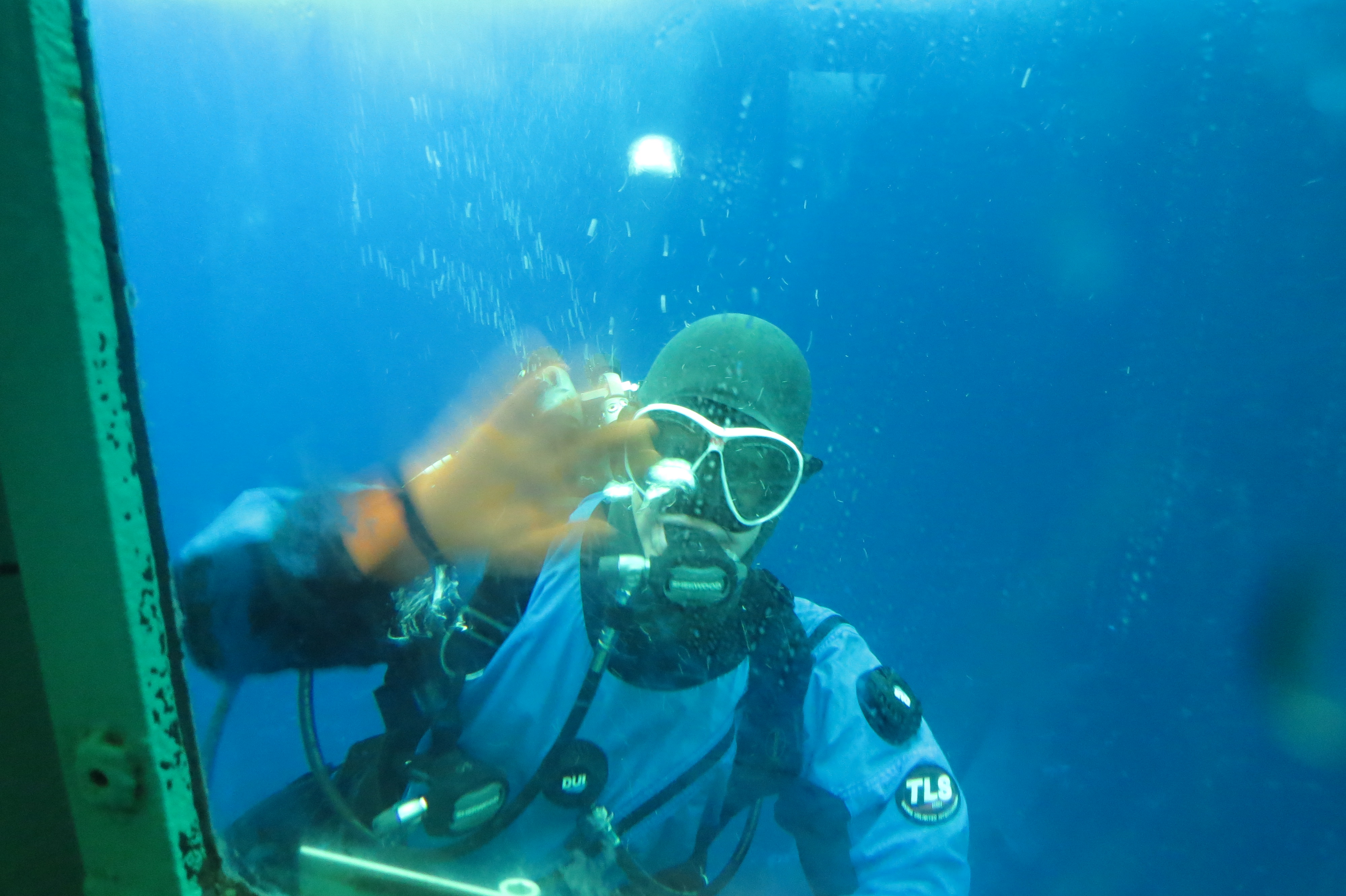 Diver Kirsten Carlson waves to Jennifer Bault who is inside the underwater Observation Tube. McMurdo Sound, Antarctica.