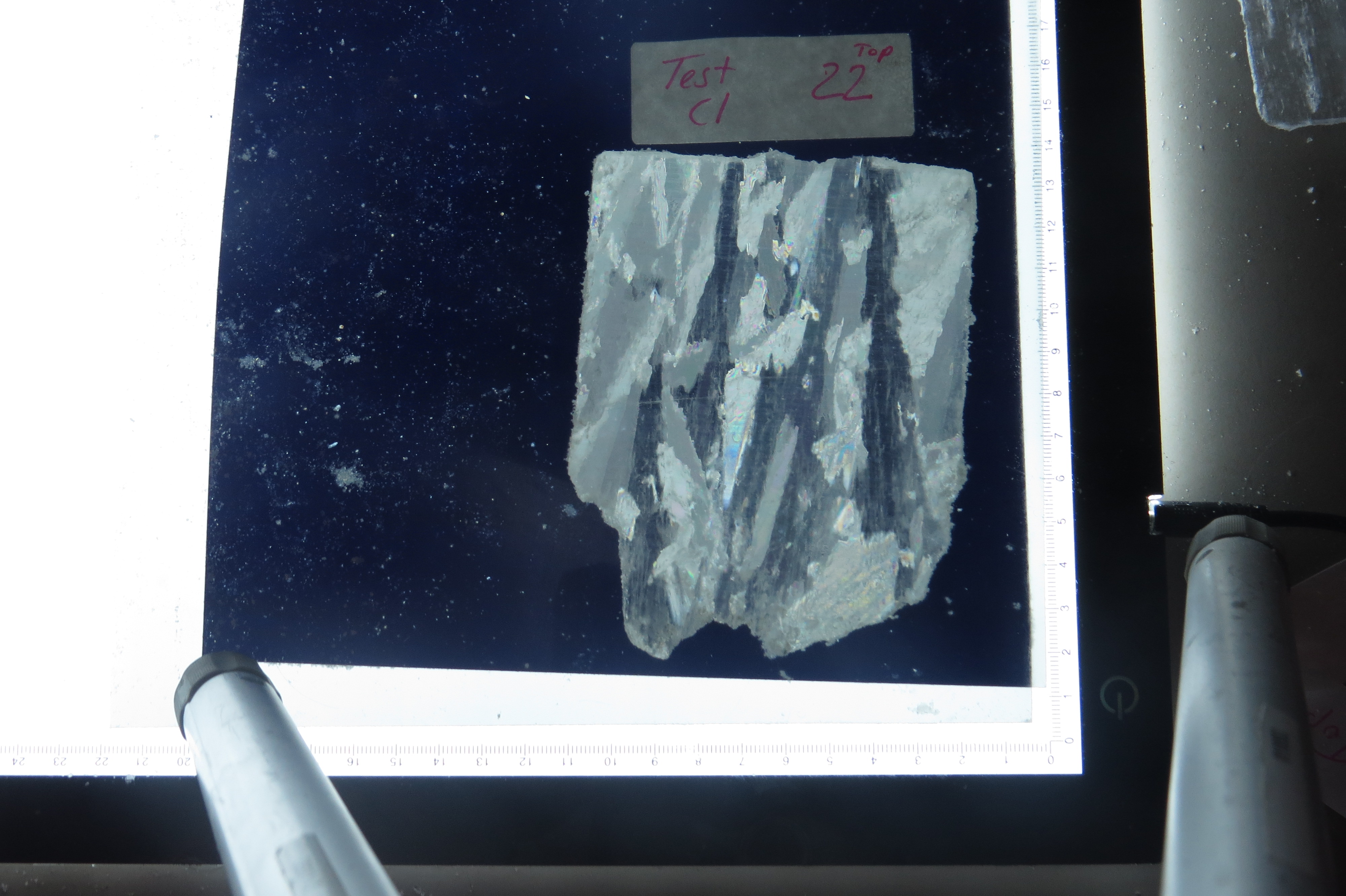Jennifer Bault: "The last section 220 cm down. The very bottom was submerged in sea water and is all platelet ice that is now completely frozen due to the cold room temperature. Lots of platelet ice crystal and brine channels allowing the brine (salty water) to escape into the sea." McMurdo Station, Antarctica.