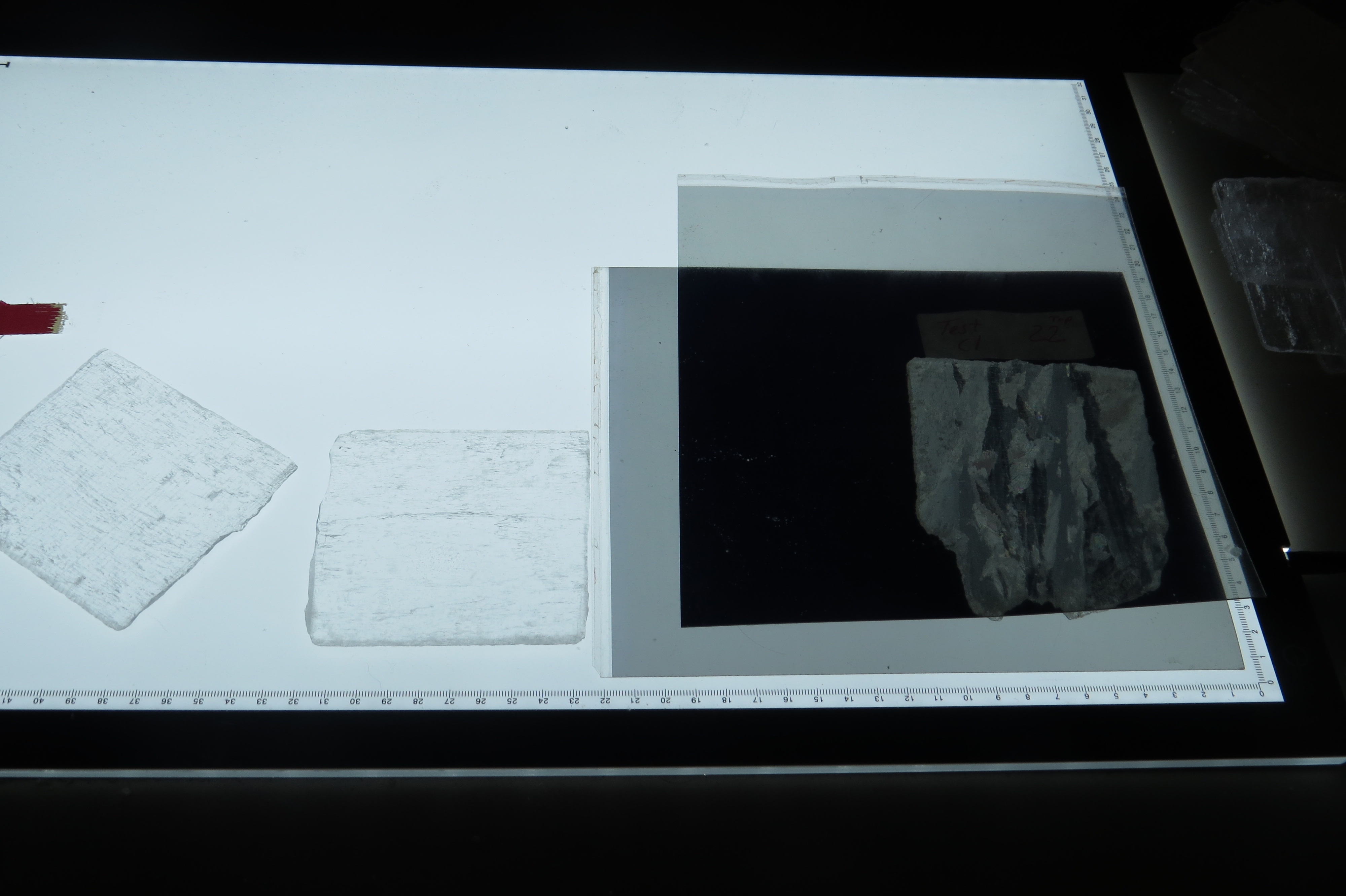 A light table with thinly cut ice sections and gels. McMurdo Station, Antarctica.