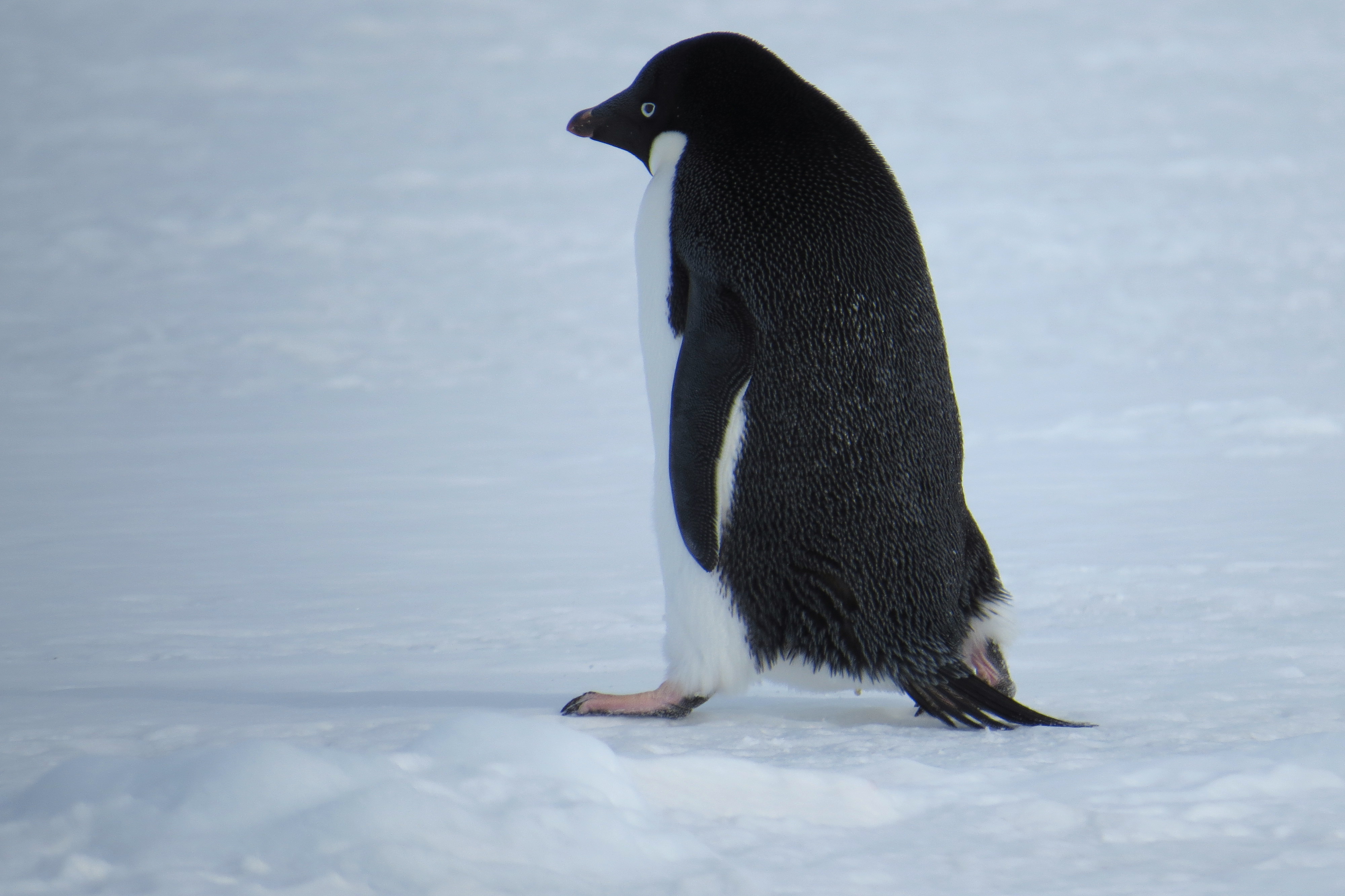 An Adélie penguin waddles by on the sea ice of the Ross Sea, Antarctica.