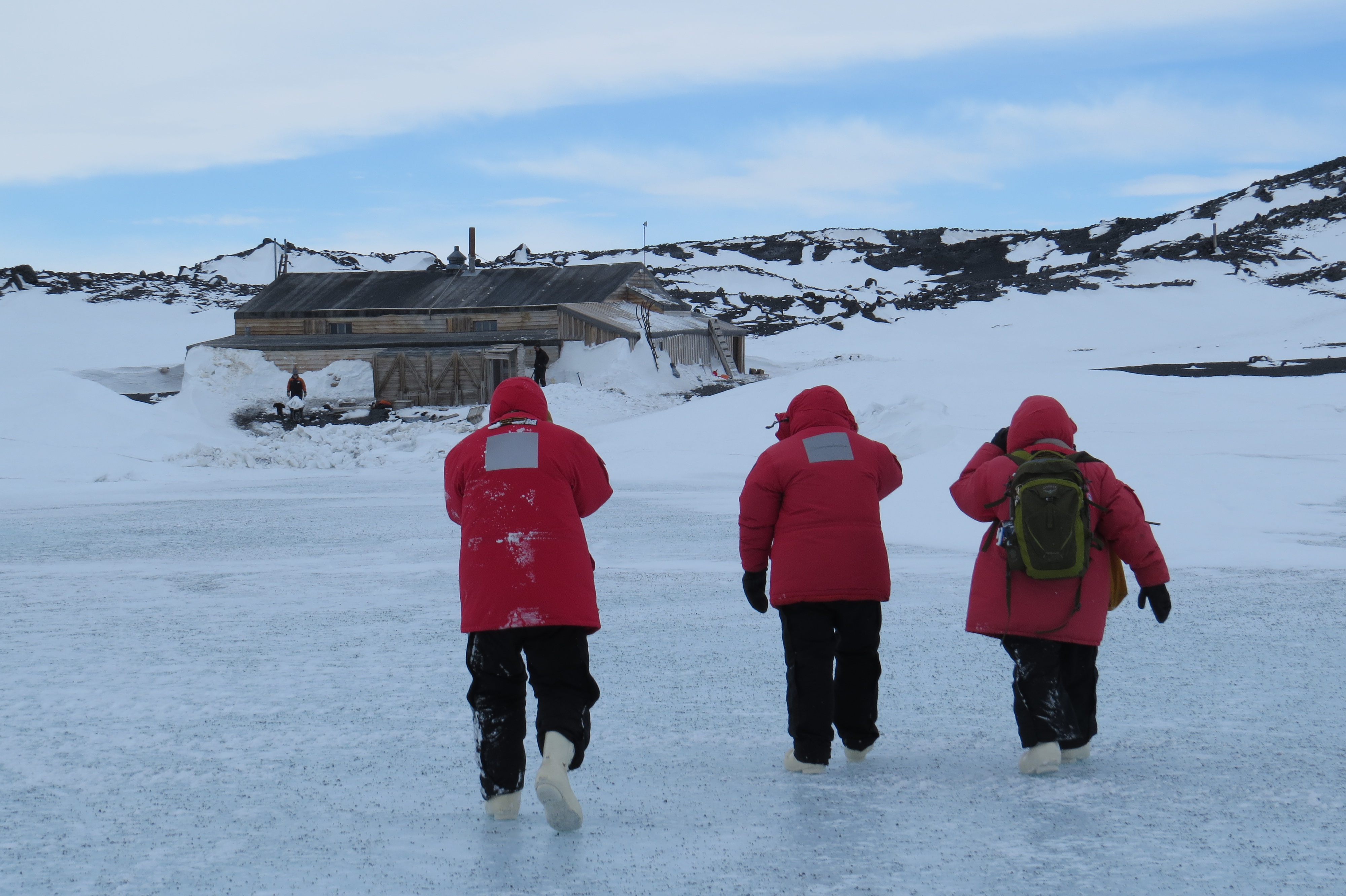 Team members hike across ice to Robert Falcon Scott's Terra Nova Hut at Cape Evans, Antarctica.