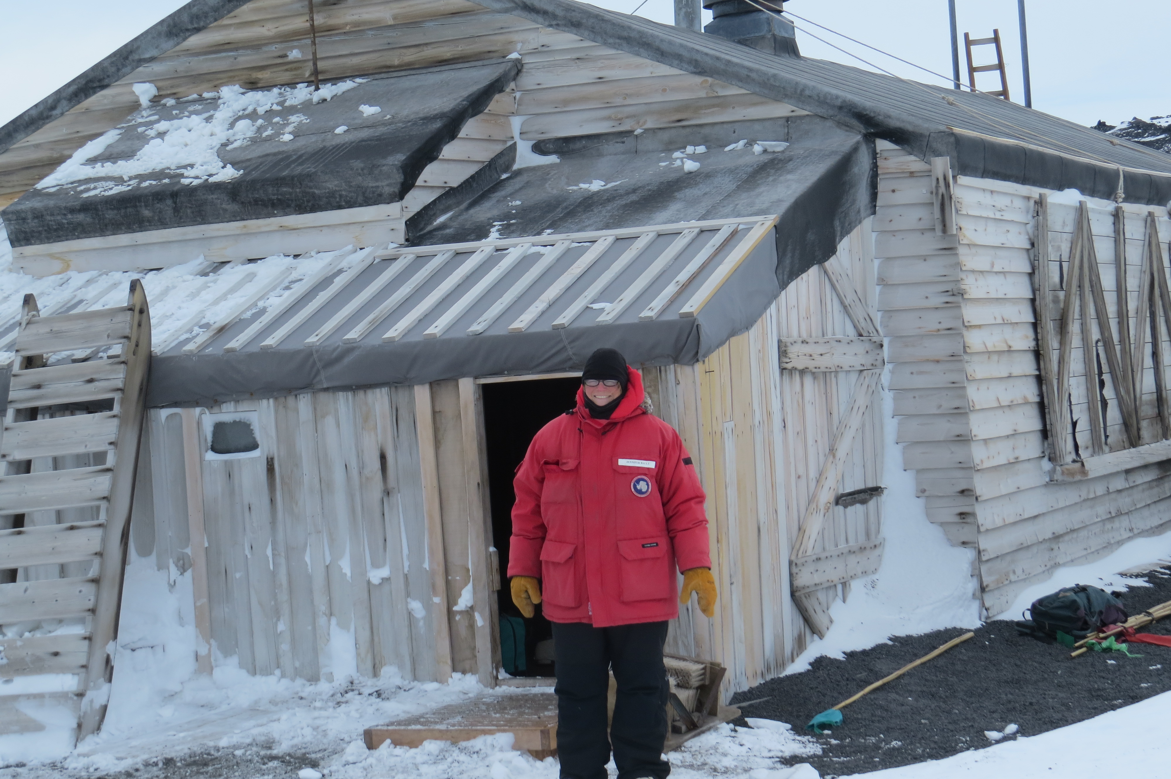 Jennifer Bault poses outside of Robert Falcon Scott's Terra Nova Hut at Cape Evans, Antarctica.