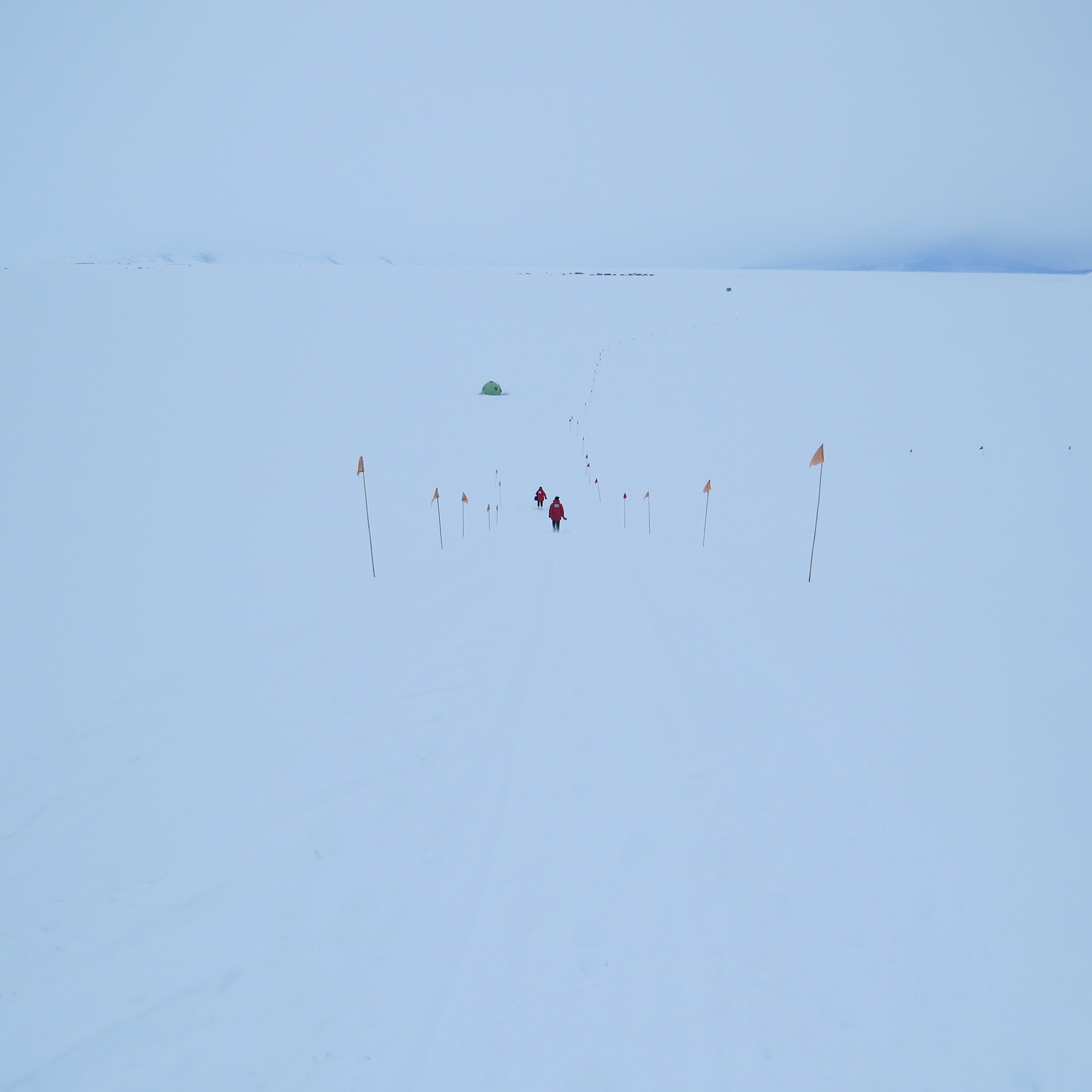 The team spots the green 'apple' (a safety shelter) maintained by New Zealand's Scott Base, which is another two miles from the apple. Castle Rock Loop Trail, Ross Island, Antarctica.
