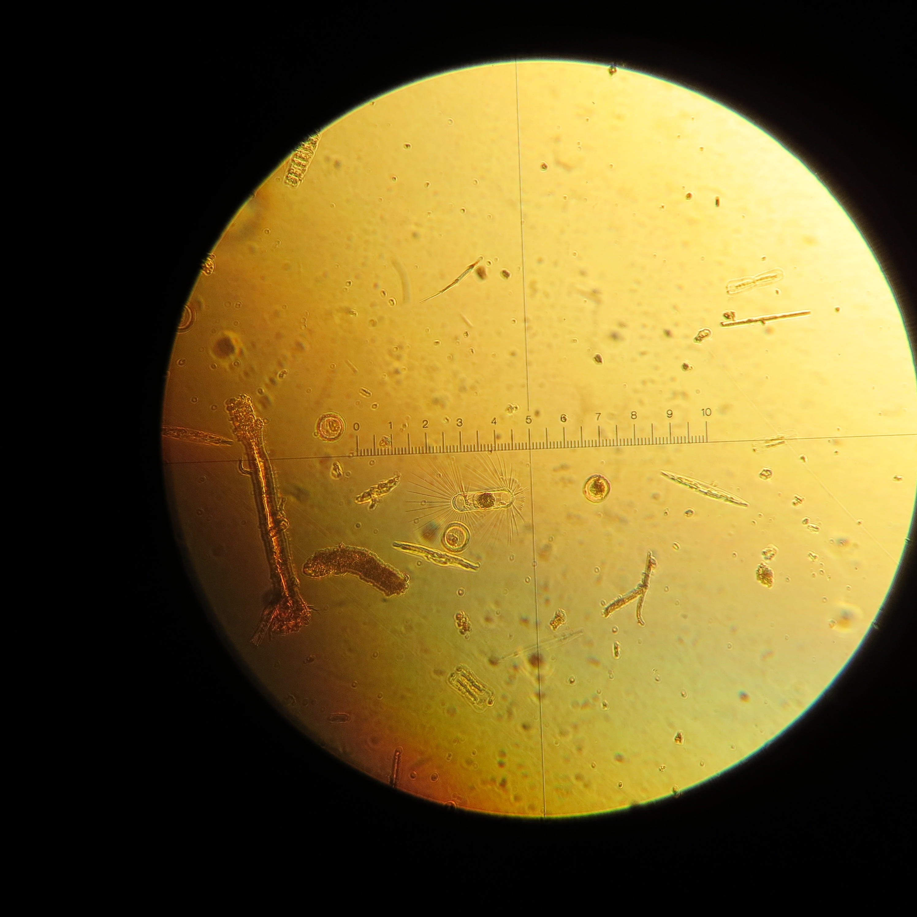 Diatoms viewed under a microscope from the team's sample of platelet slush ice. McMurdo Station, Antarctica.