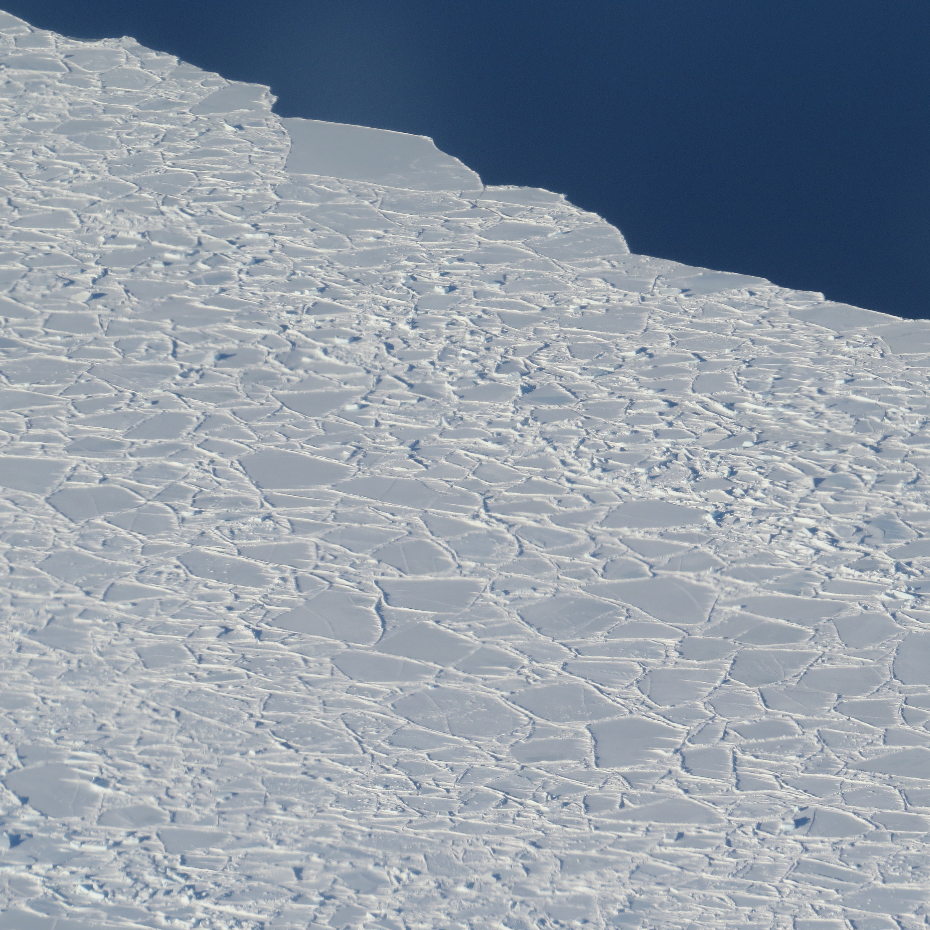 Jennifer Bault: "The ice appears very scaly due to being broken and seamed back together from the tidal and wave action of the ocean." Flying in an LC-130 over the Ross Sea, Antarctica.