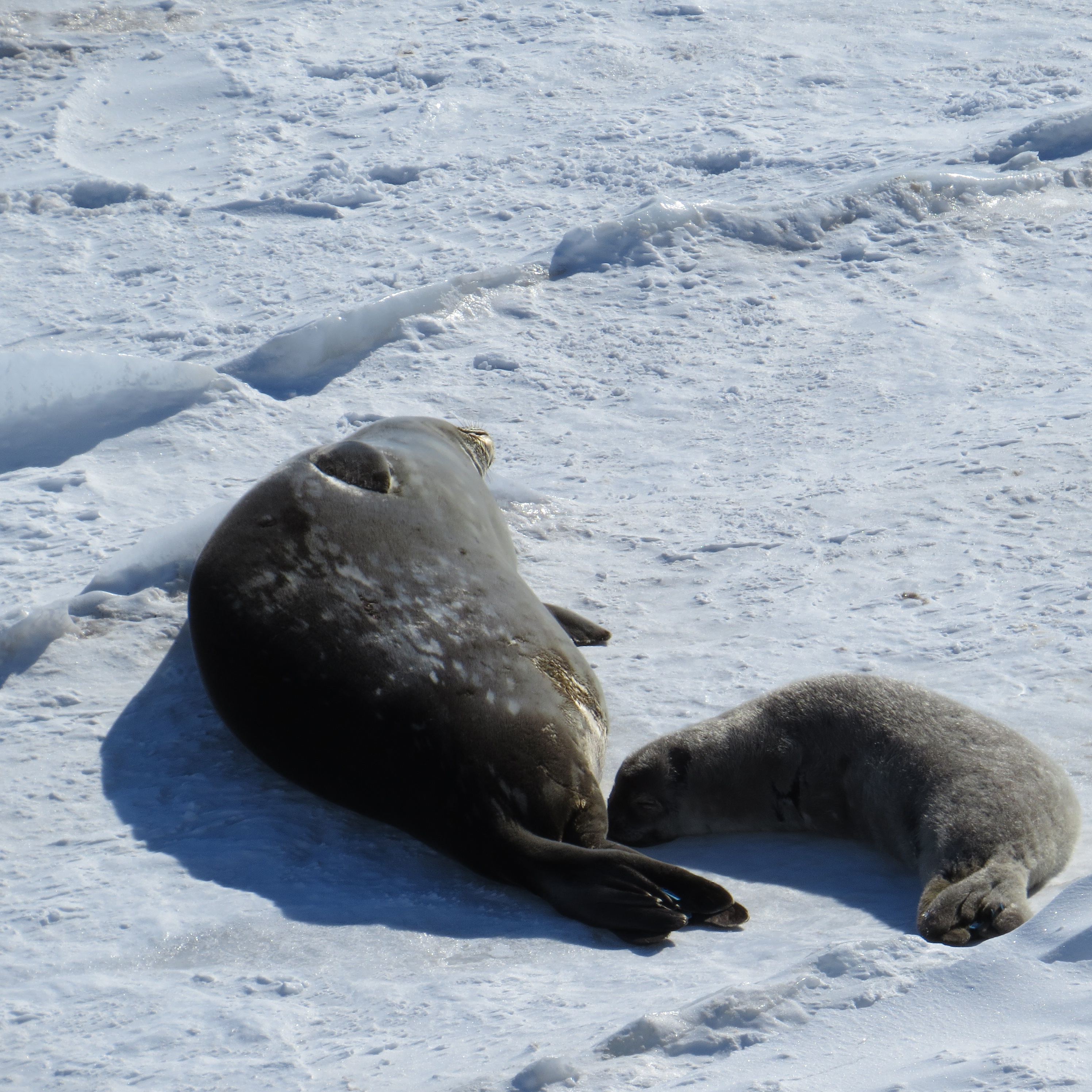 A mother Weddell seal and her pup on a sunny day near McMurdo Station, Antarctica.