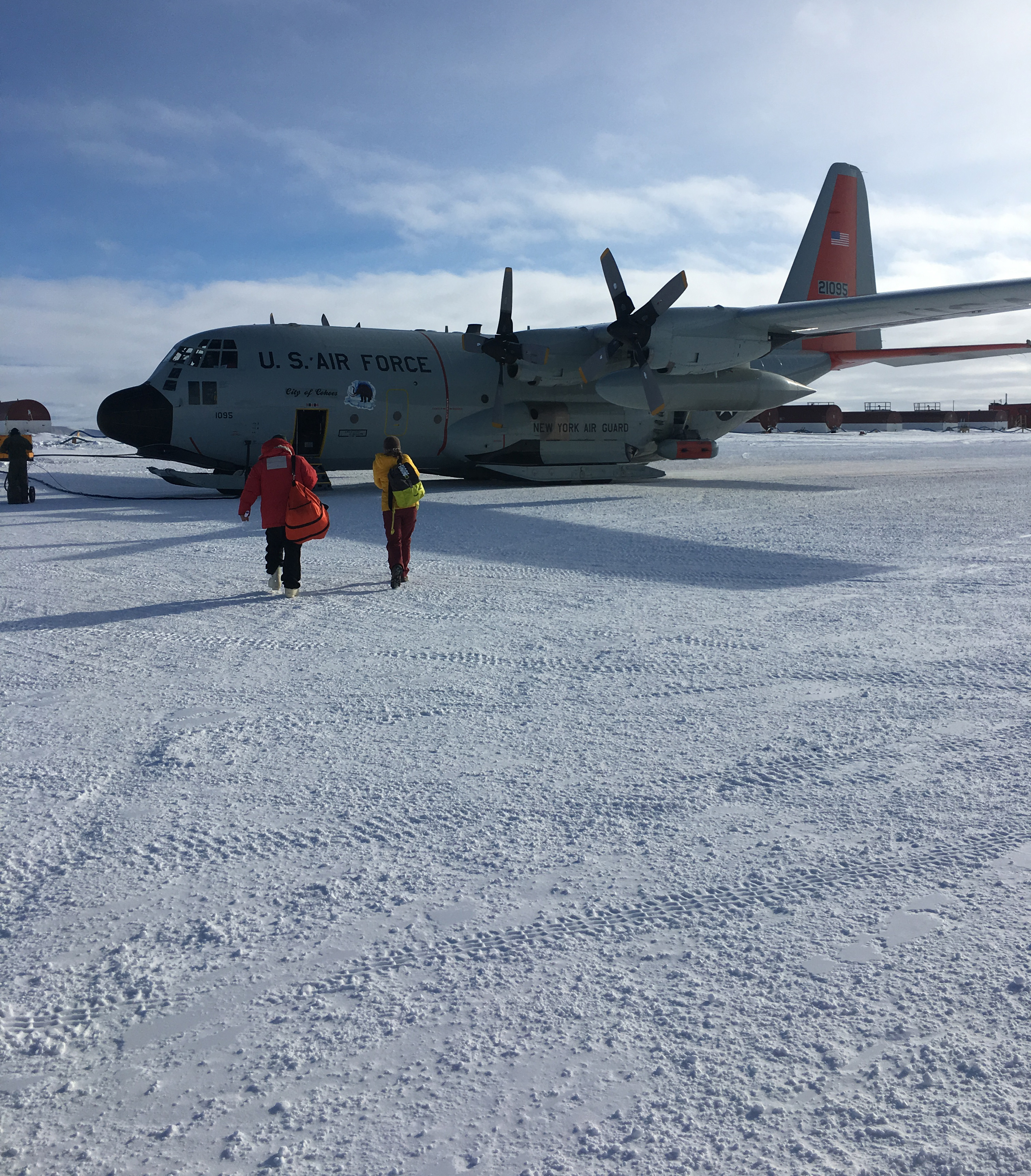 The team heads to the LC-130 that flies the Ice Pod flights. McMurdo Station, Antarctica.