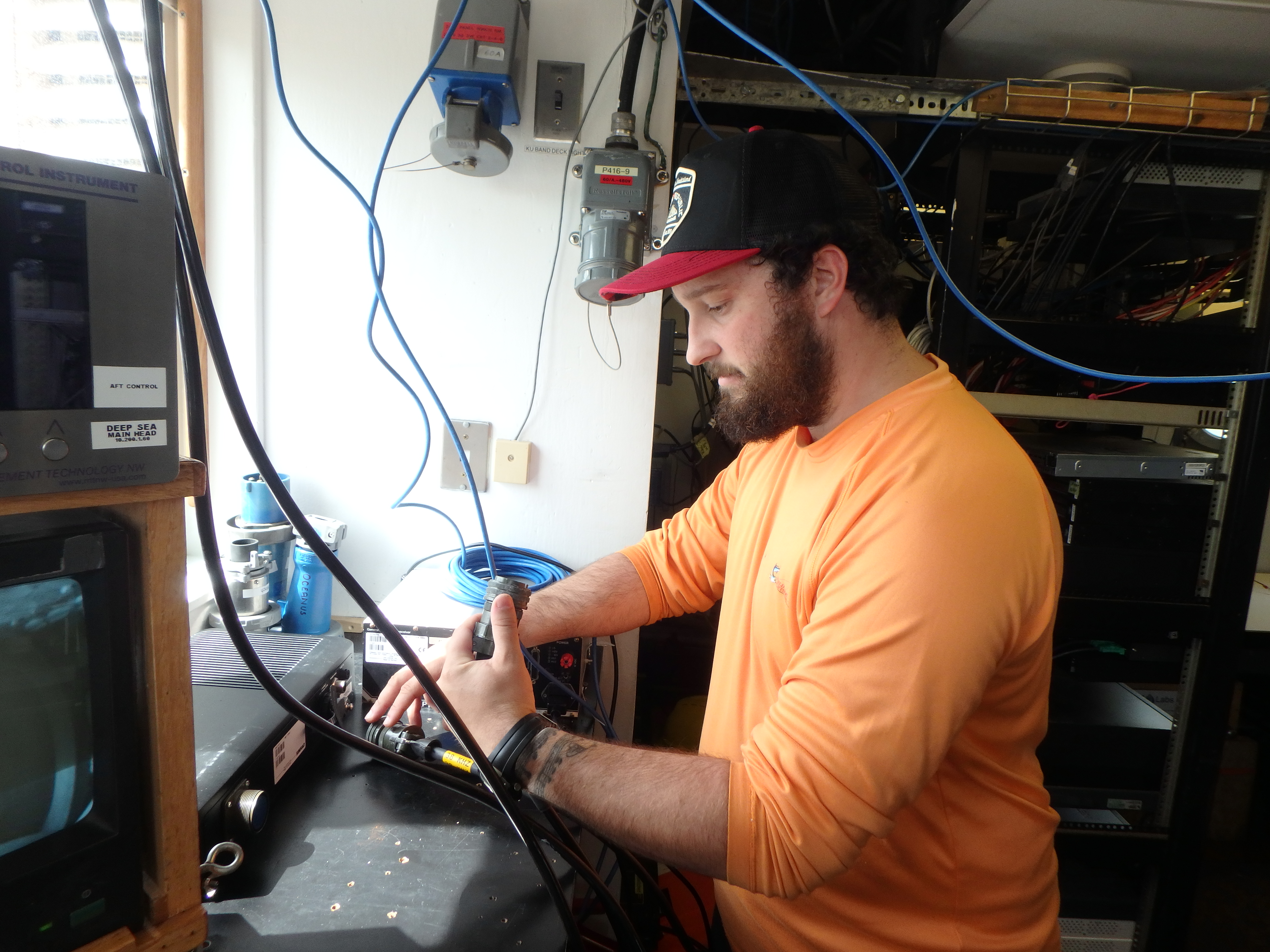 Jonathan Witmer, Acoustics Technician, works on equipment. Aboard the R/V Oceanus in the Eastern Bering Sea.