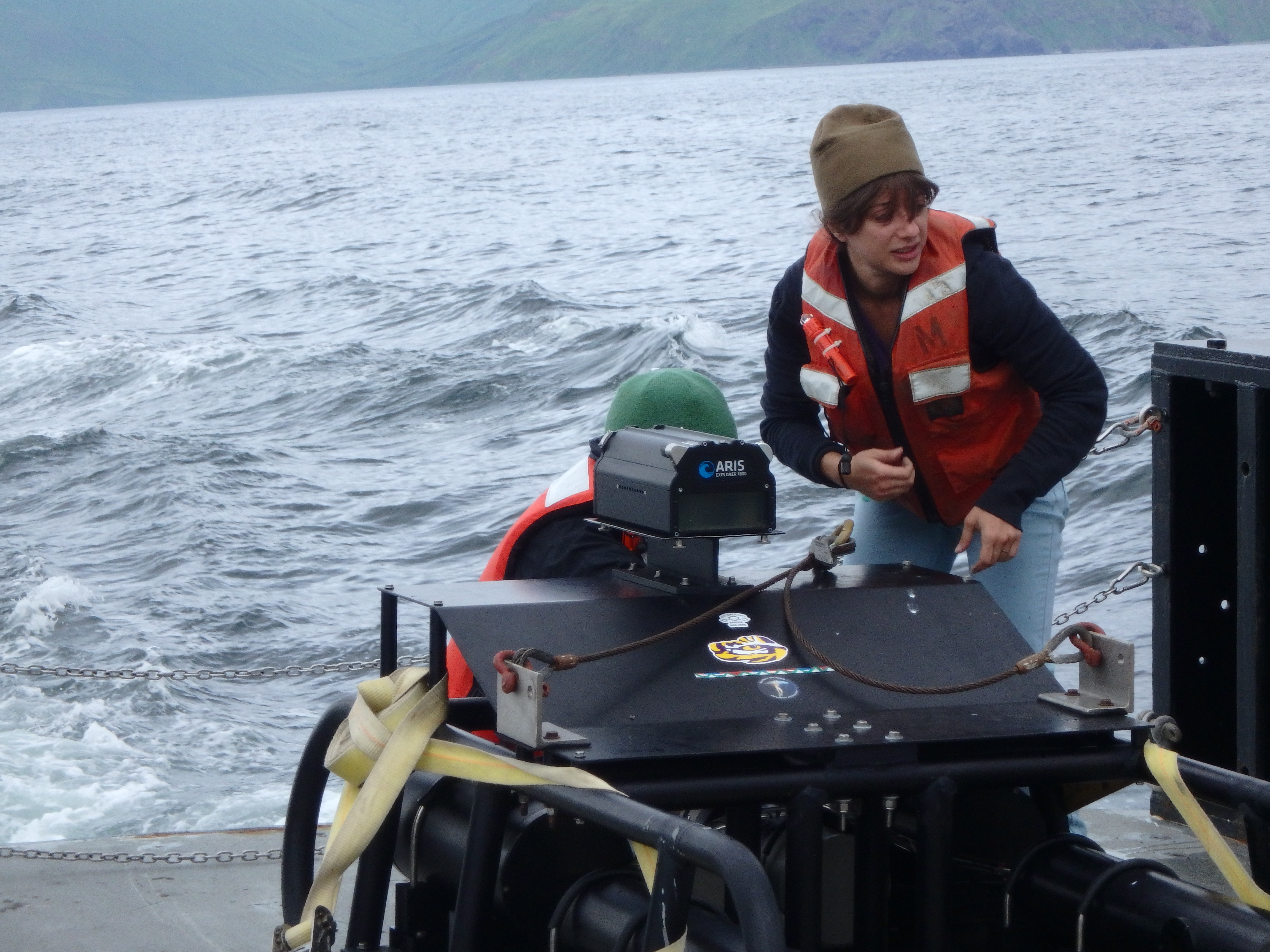 Suzanne Sharestani gets the ZOOVIS/ARIS ready for deployment. Aboard the R/V Oceanus in the Eastern Bering Sea.