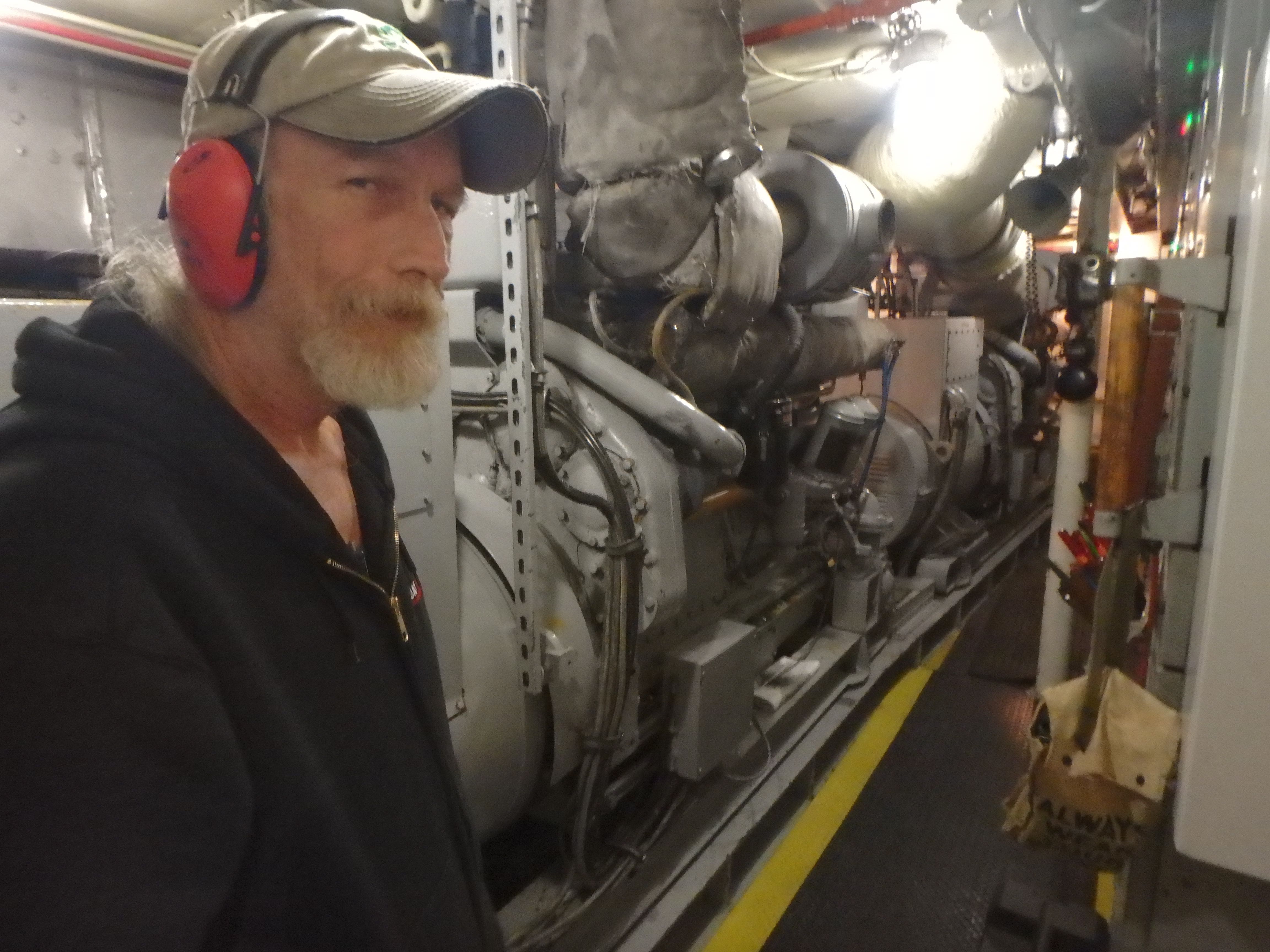 Chip Millard, First Assistant Engineer, offers a tour of the engine room. Aboard the R/V Oceanus in the Eastern Bering Sea.