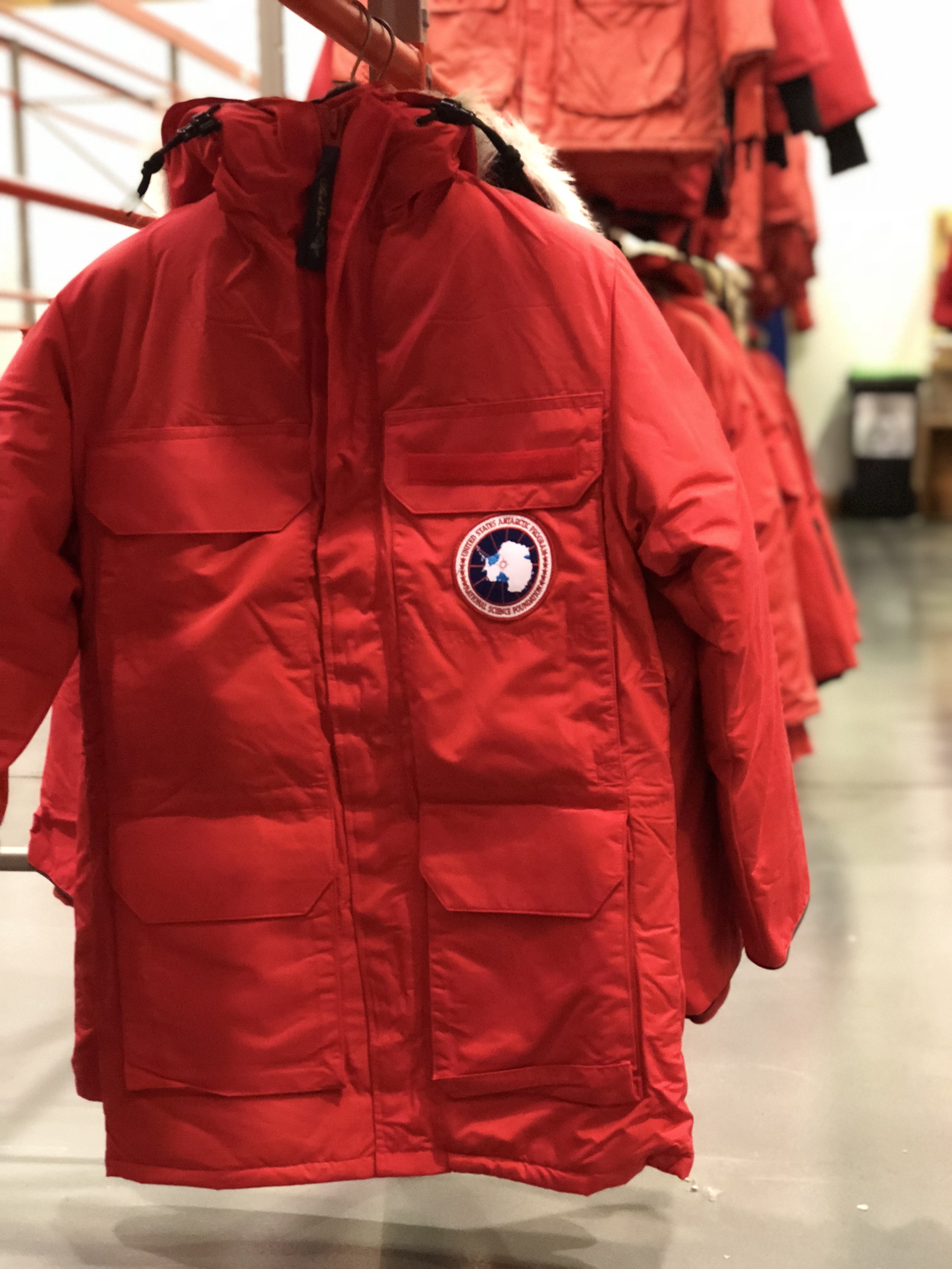 The "Big Red" parka that is standard issue from the Clothing Distribution Center in Christchurch, New Zealand.