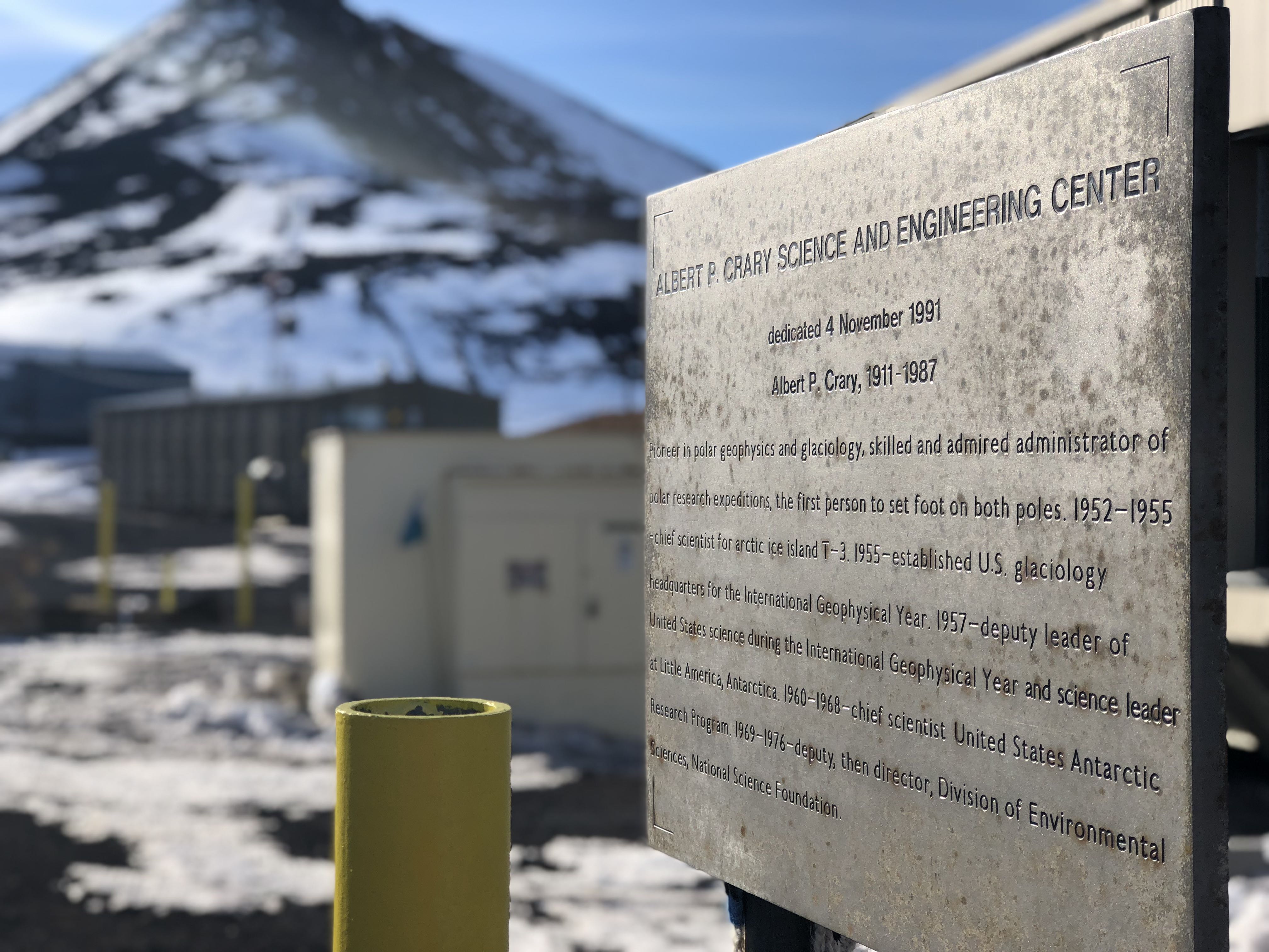 The welcome sign outside of the Crary Library in McMurdo Station, Antarctica.