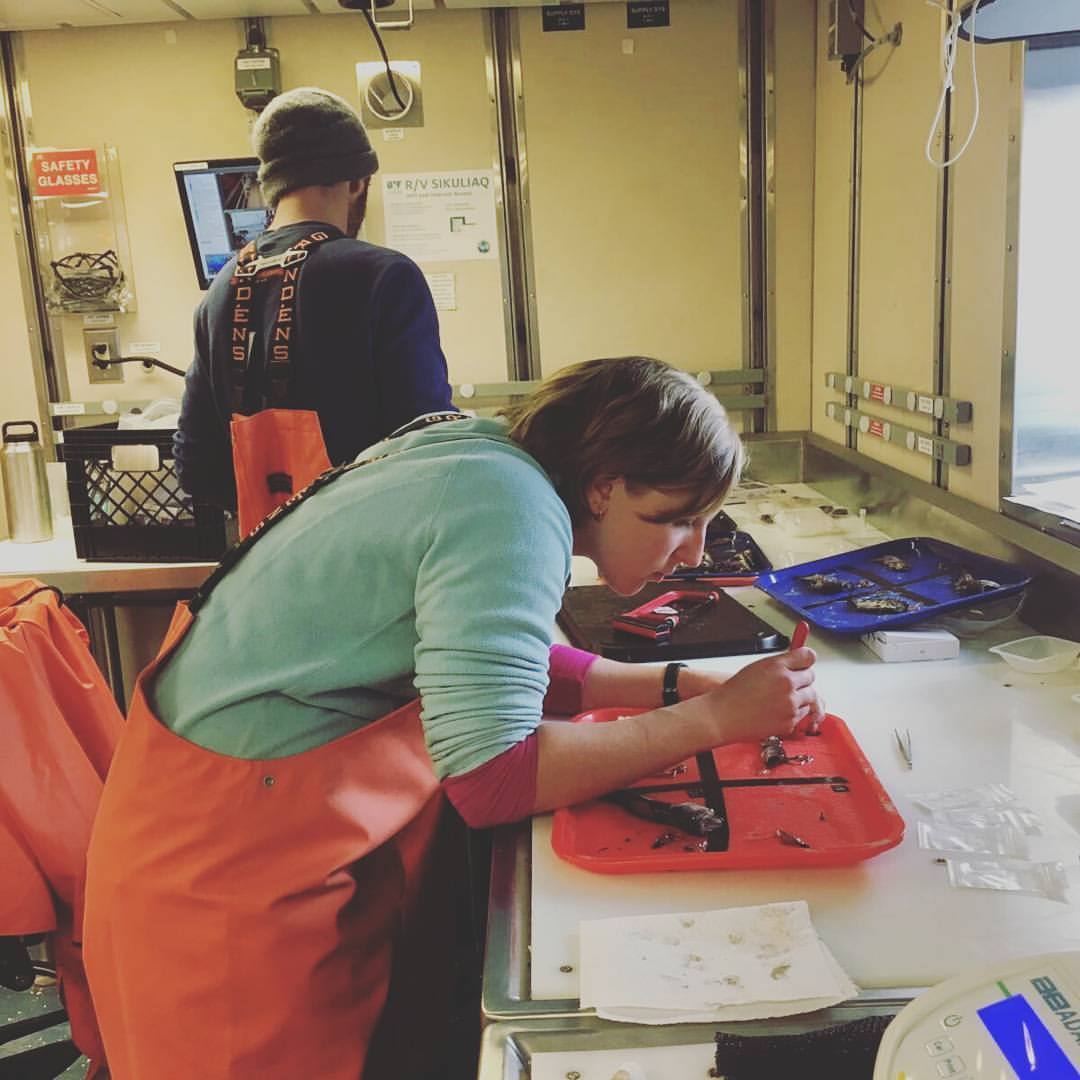 Chrissy Hernandez and Justin Suca dissecting Arctic cod in the ship's wet lab. Aboard the R/V Sikuliaq in the Beaufort Sea.