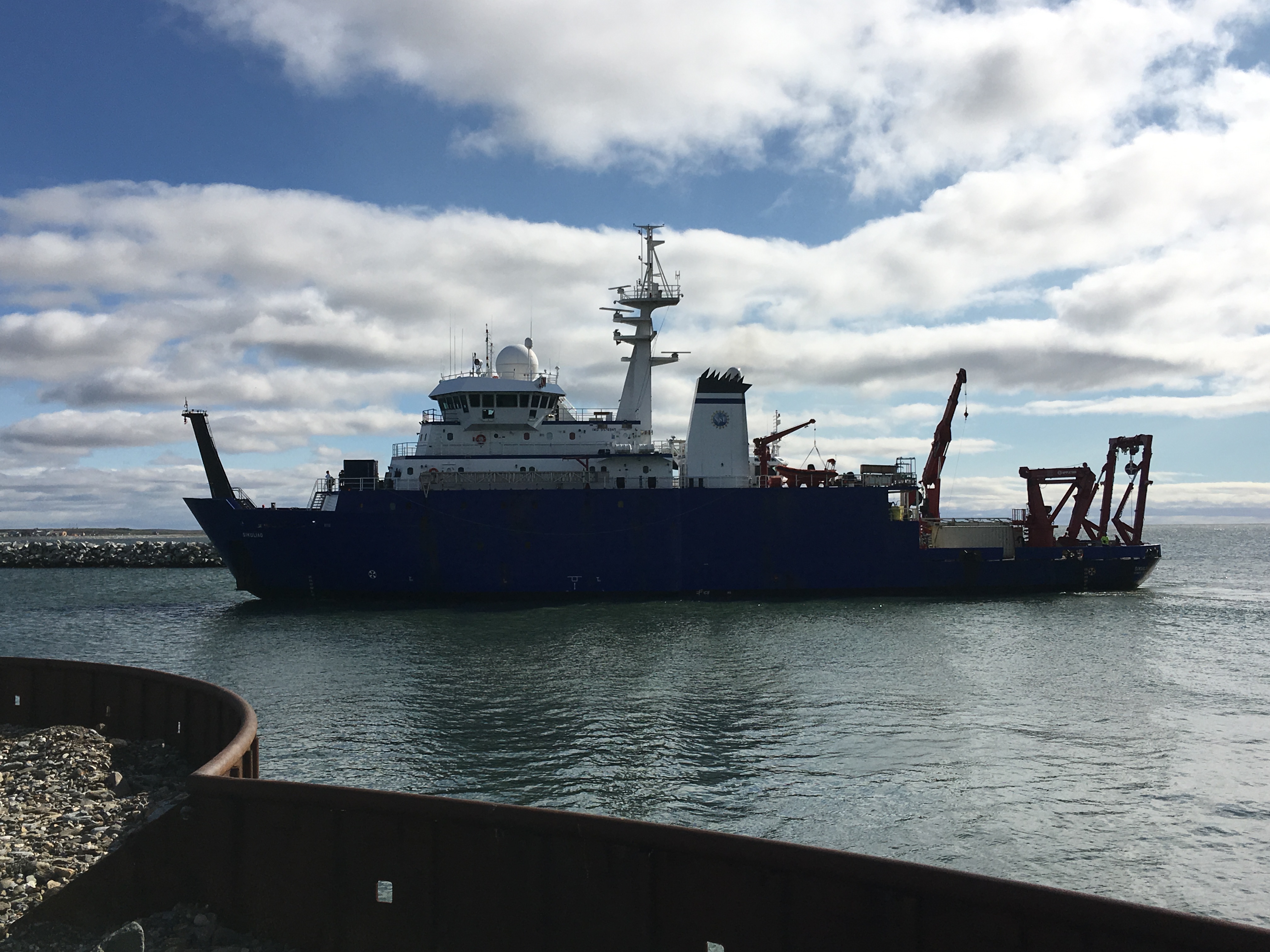 The R/V Sikuliaq maneuvers in the channel entrance as it readies to dock in Nome, Alaska.
