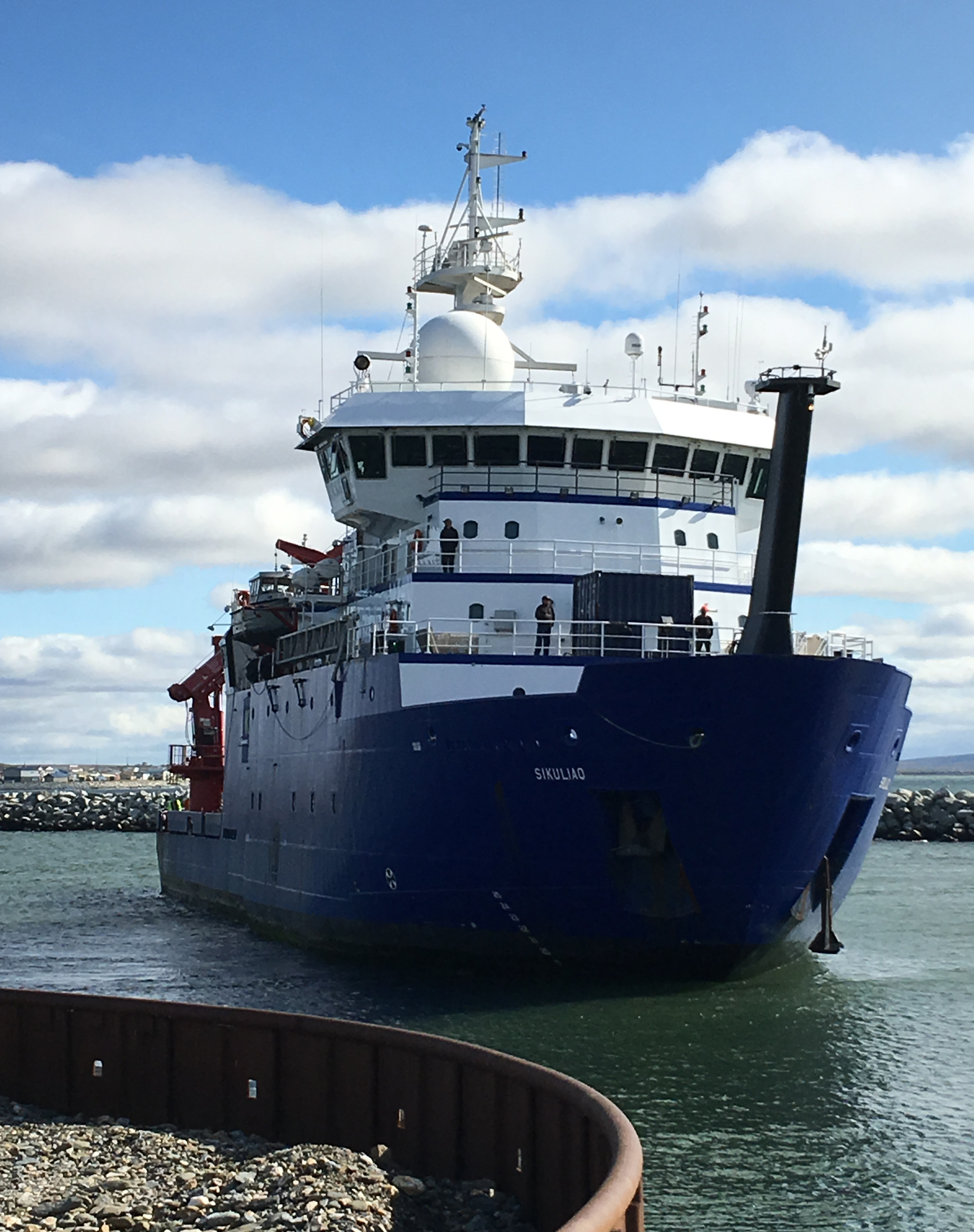 The R/V Sikuliaq maneuvers in the channel entrance as it readies to dock in Nome, Alaska.