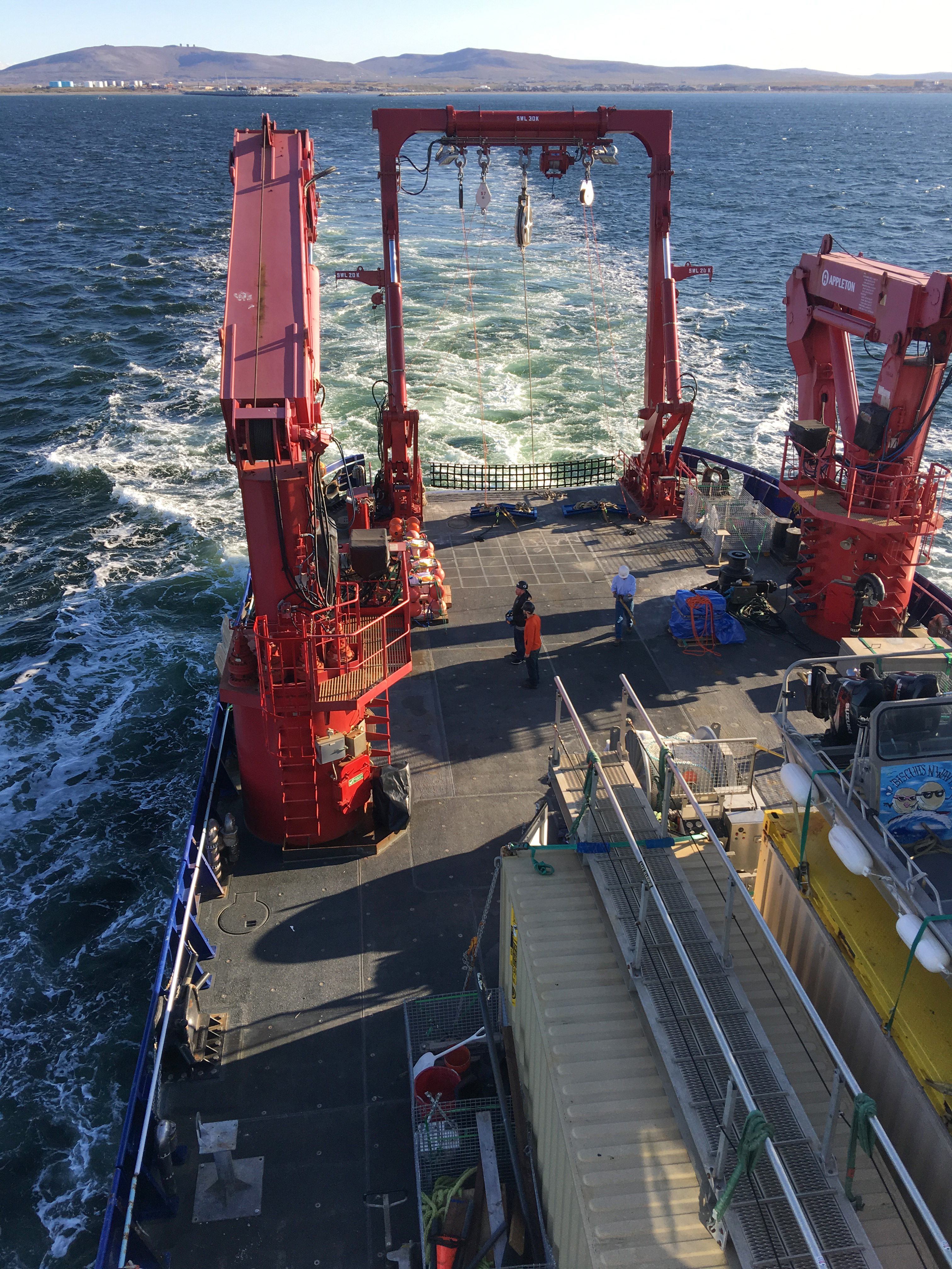 The view looking back to Nome, Alaska and the wake of the ship as the R/V Sikuliaq departs.