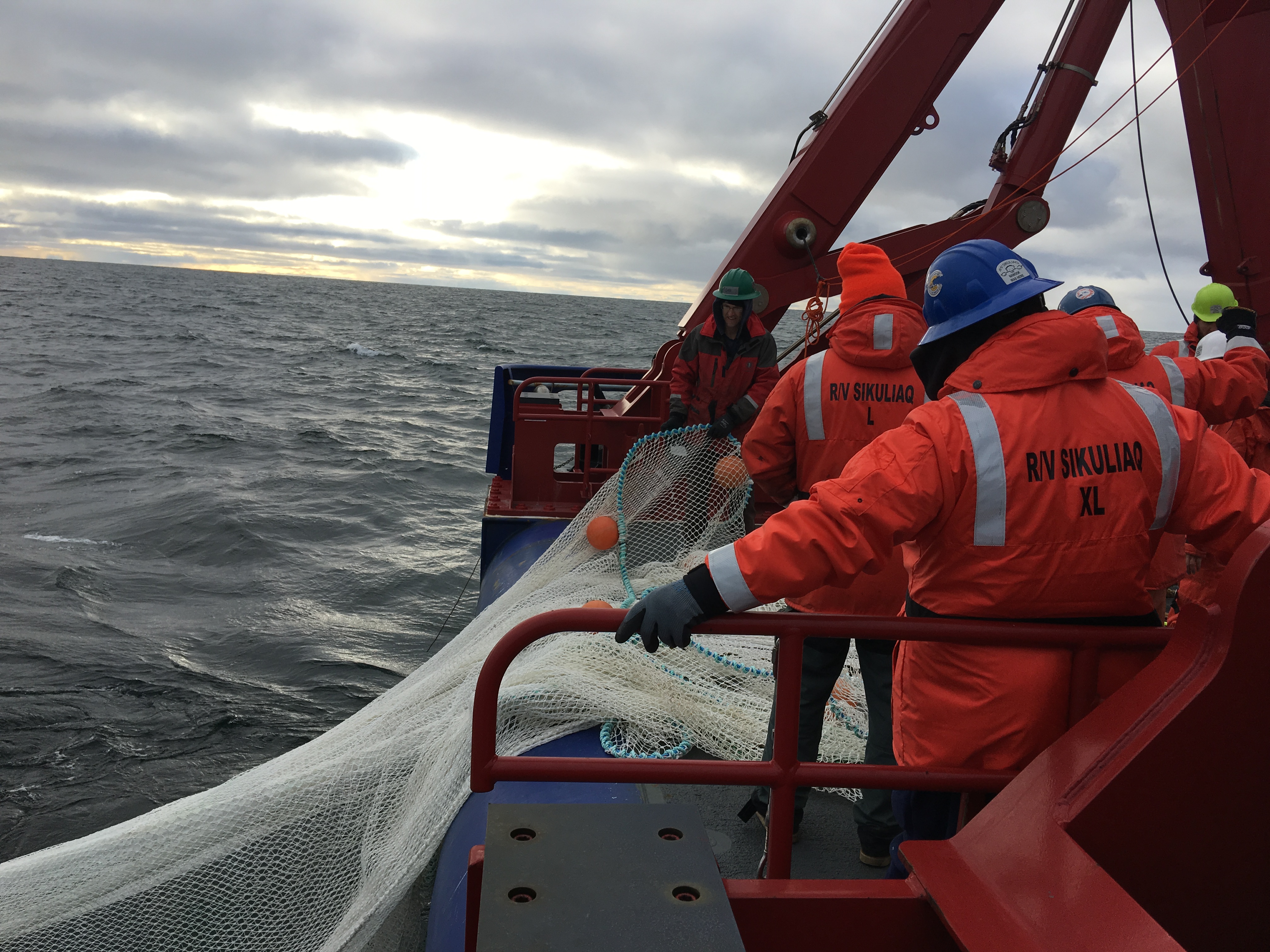 The crew brings the mid-water trawl net back in. Aboard the R/V Sikuliaq in the Beaufort Sea.