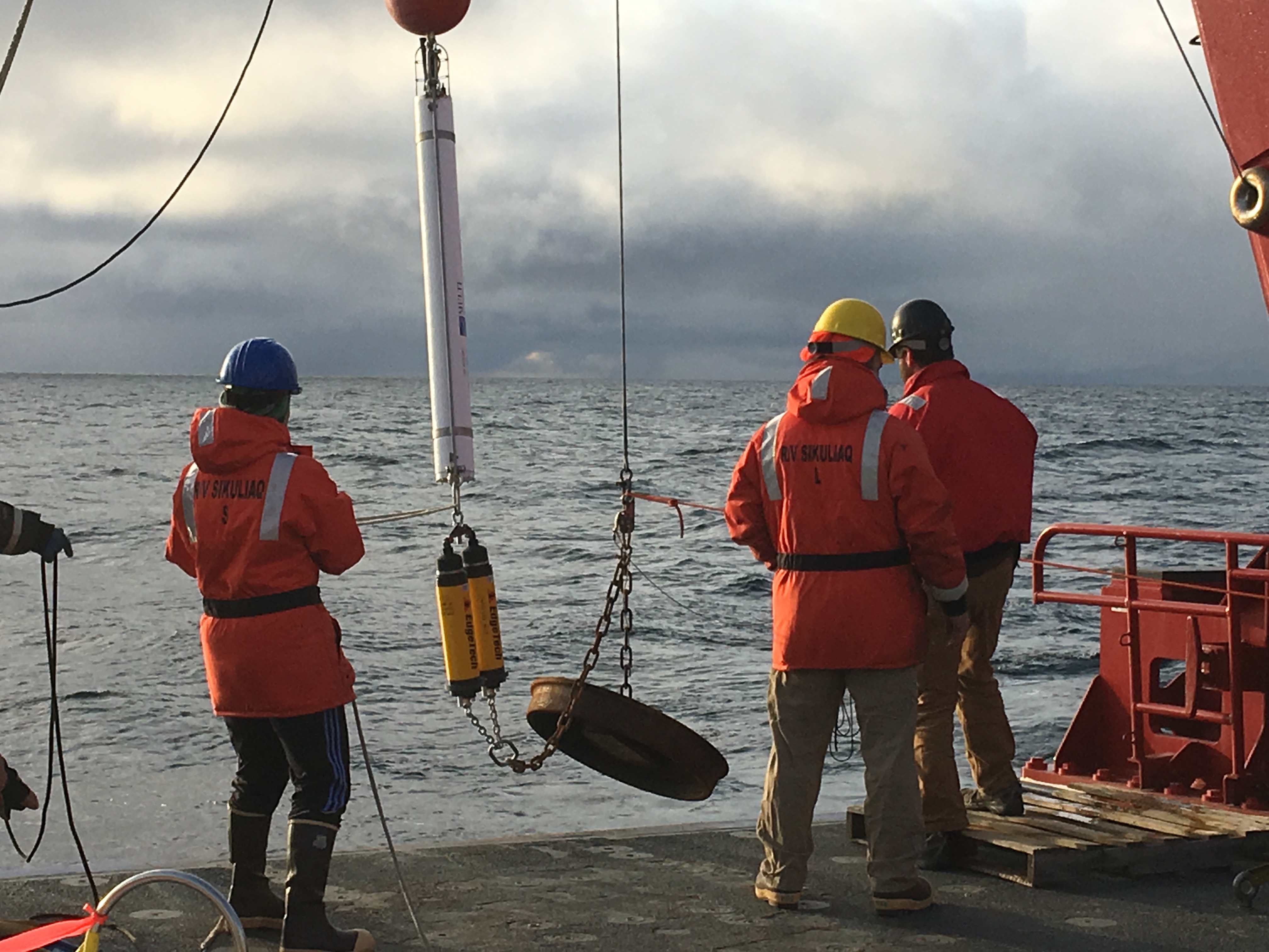 The Acoustic Zooplankton Fish Profiler goes into the water off the aft deck. The AZFP is set on a mooring on the bottom of the Beaufort Sea floor. Aboard the R/V Sikuliaq in the Beaufort Sea.