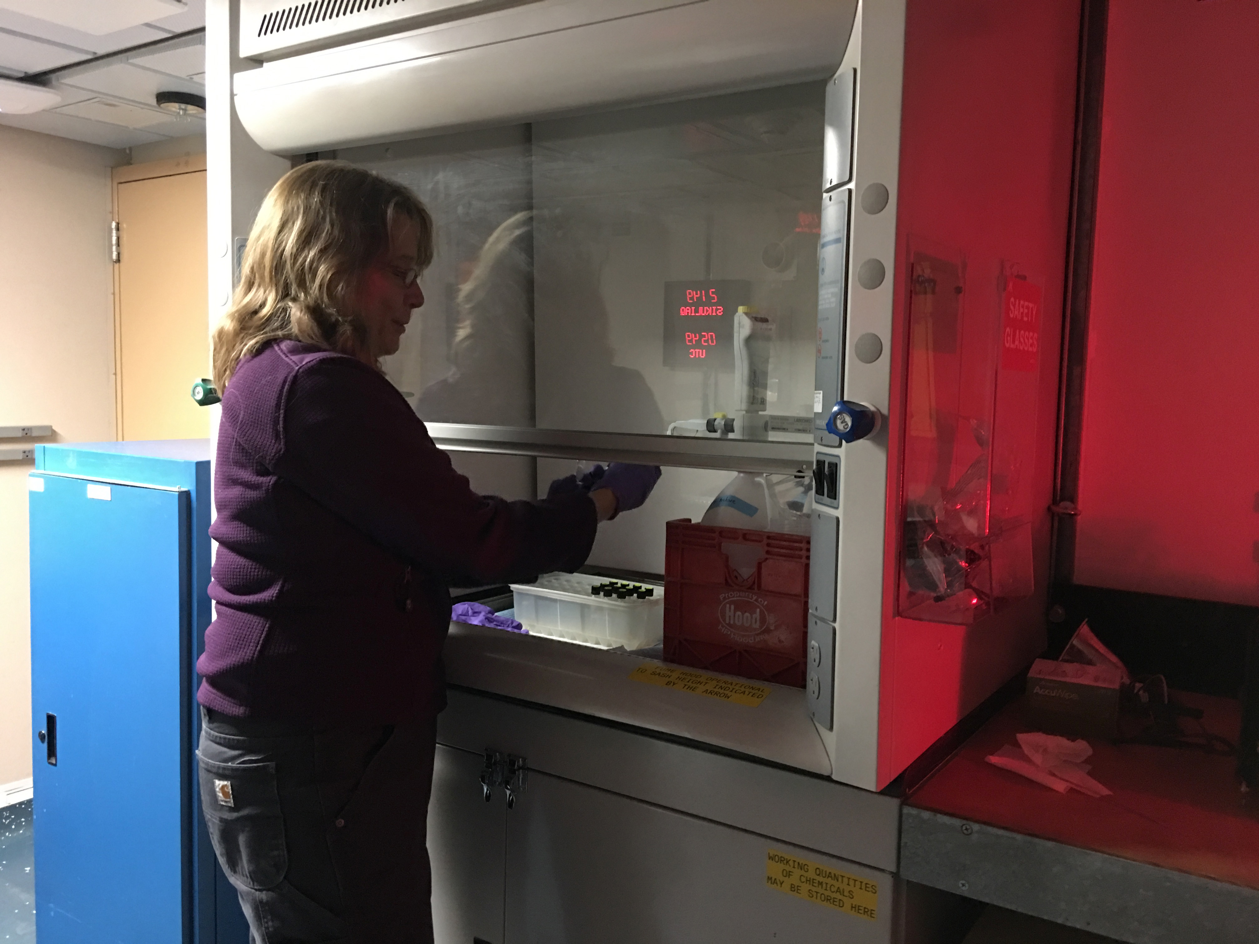 Lisa Seff adds hydrochloric acid to filtered chlorophyll samples. Aboard the R/V Sikuliaq in the Beaufort Sea.