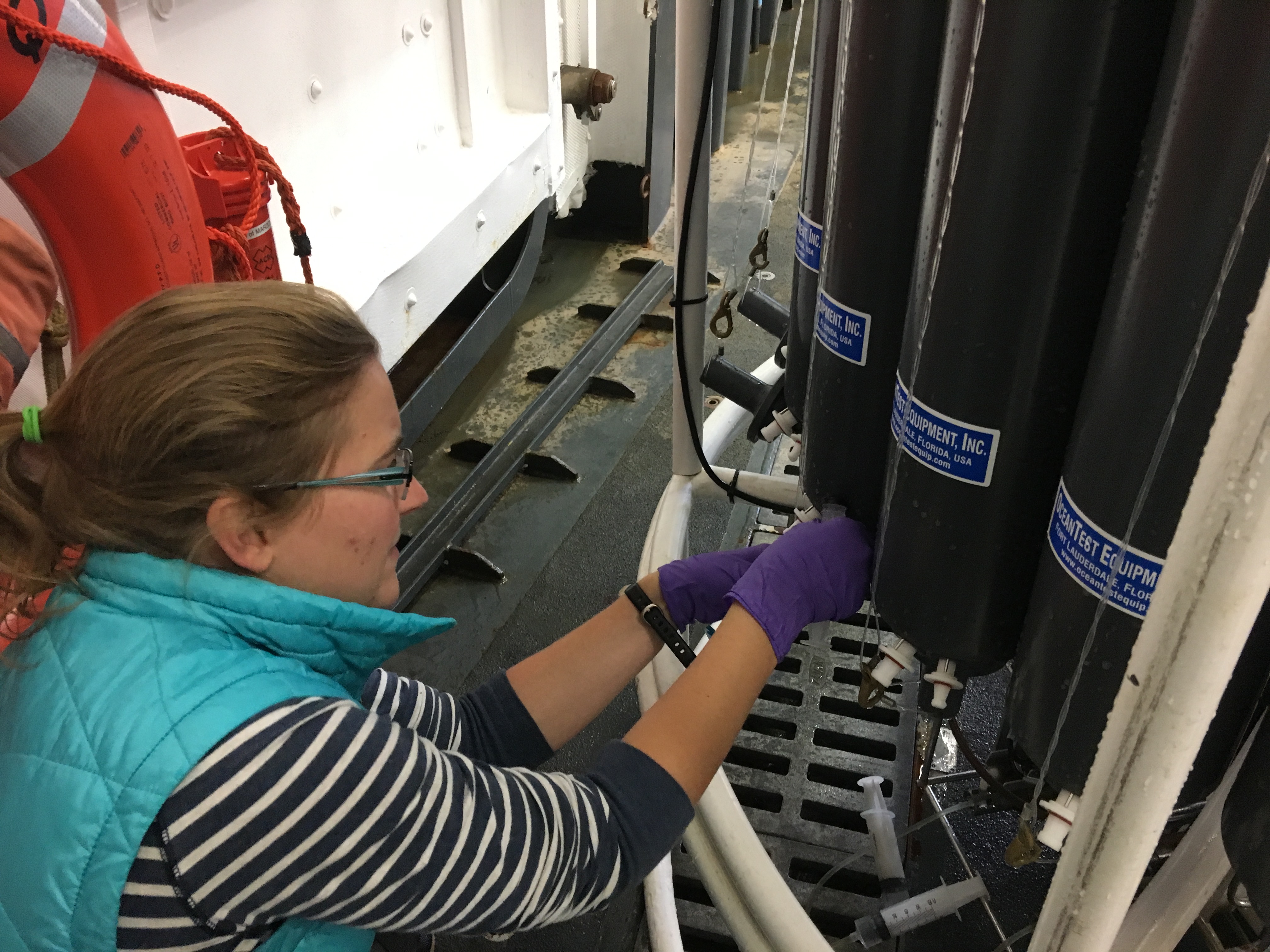 Dr. Kate Lowry collects water from a Niskin bottle. Aboard the R/V Sikuliaq in the Beaufort Sea.