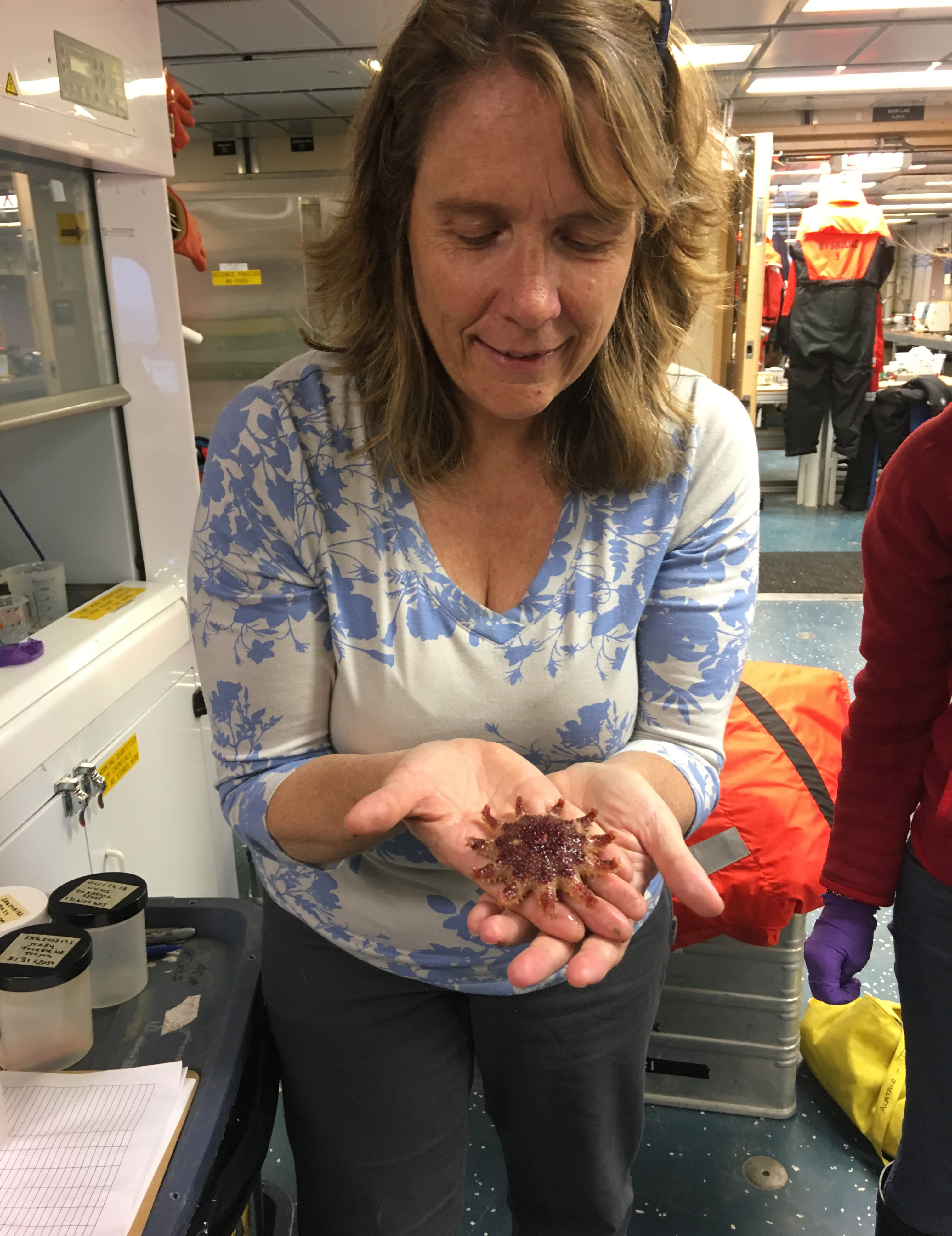 Lisa Seff holds an Arctic sun star in the wet lab. Aboard the R/V Sikuliaq in the Beaufort Sea.