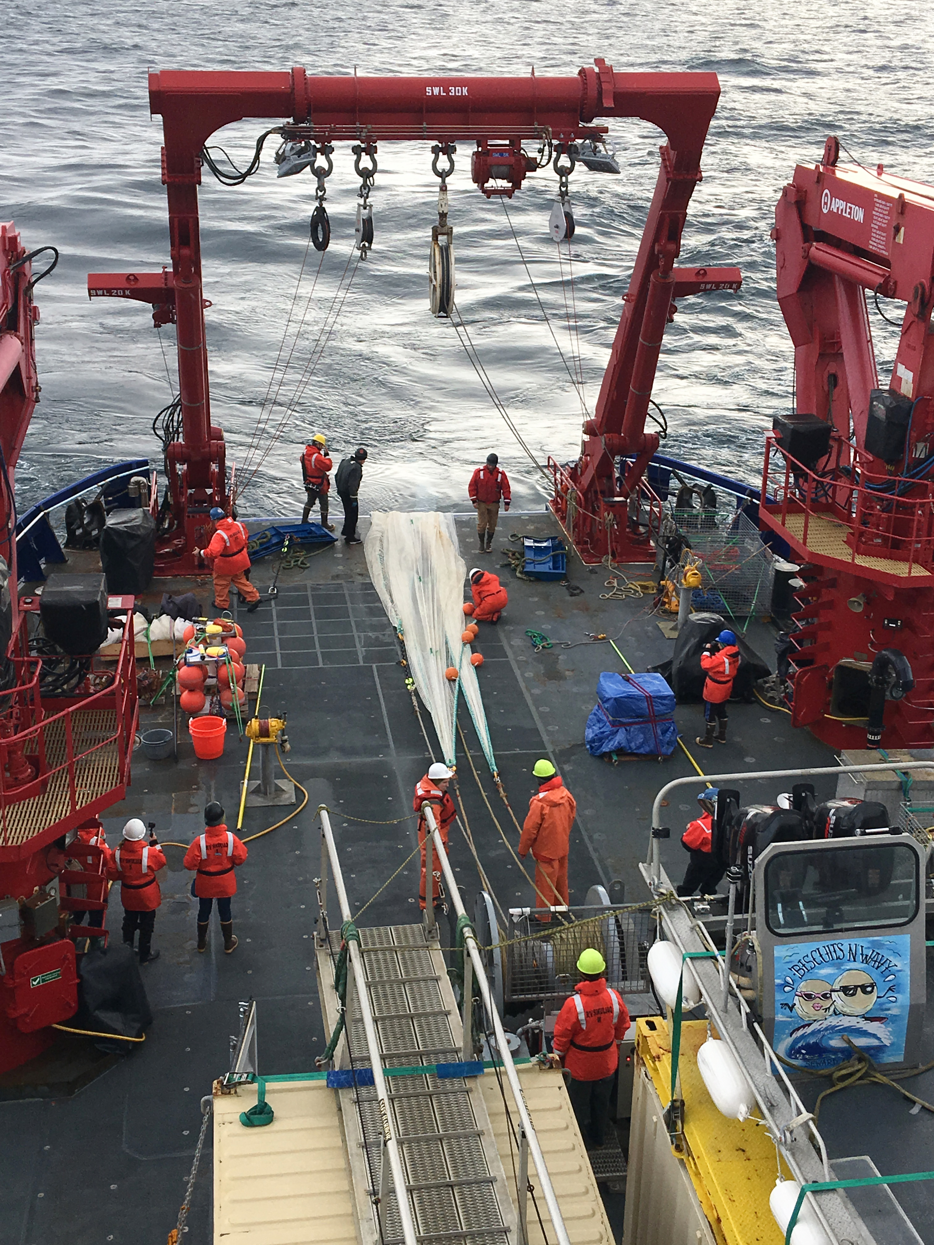 The ship's crew bring in the mid-water trawl net onto the deck. Aboard the R/V Sikuliaq in the Beaufort Sea.