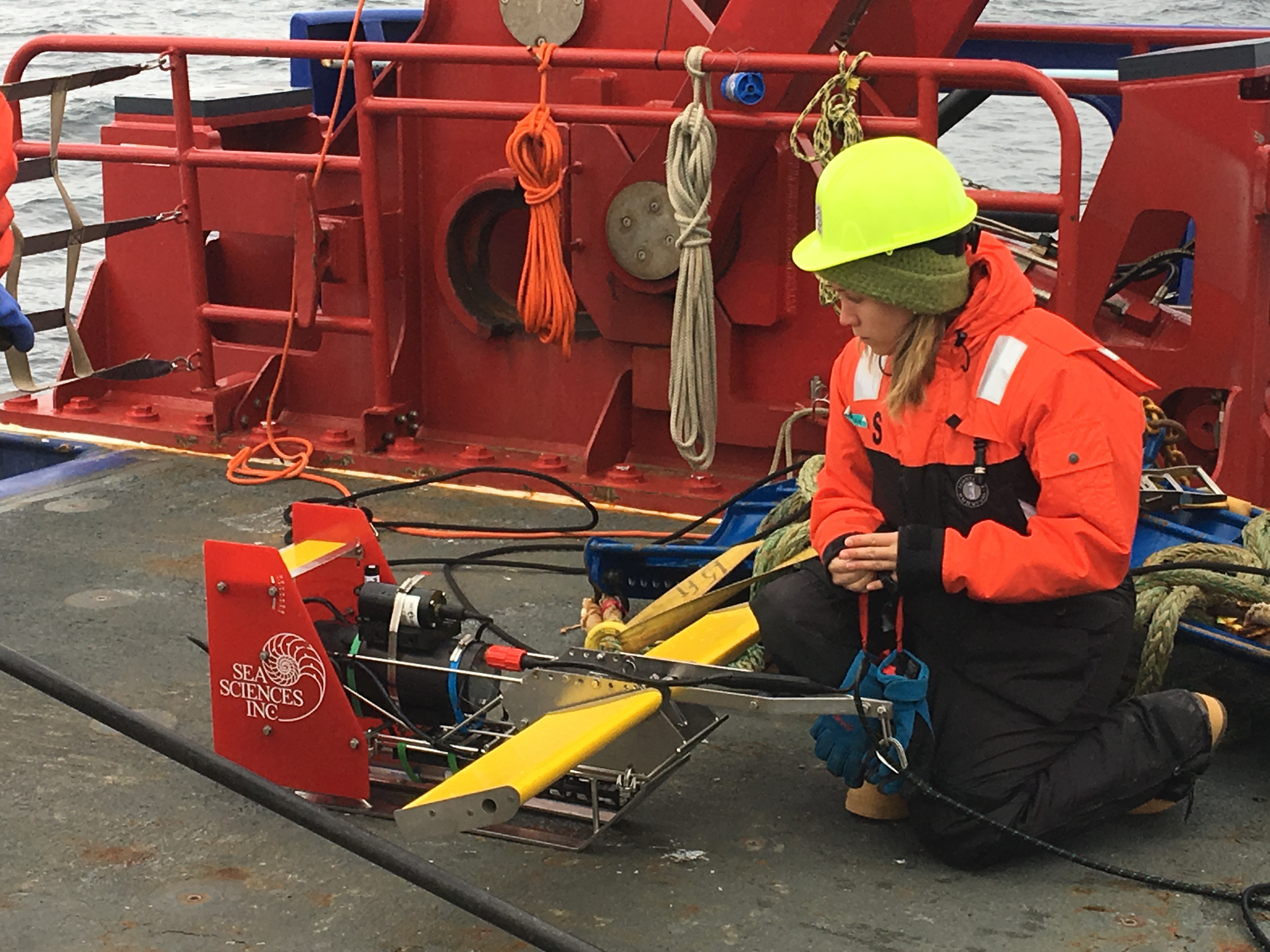 Dr. Kristina Kvile works on the ship's deck with the Acrobat instrument. Aboard the R/V Sikuliaq in the Beaufort Sea.