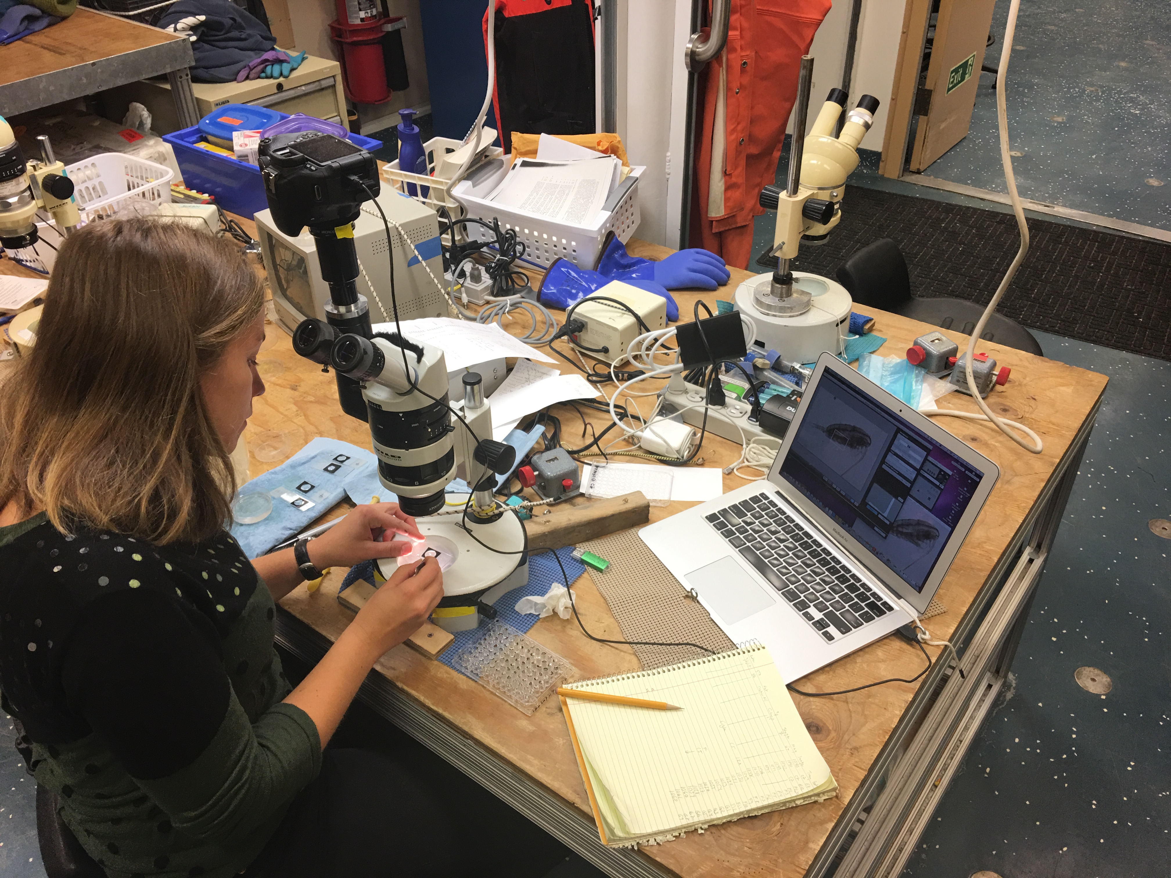 Dr. Kristina Kvile prepares a copepod to analyze under the microscope. Aboard the R/V Sikuliaq in the Beaufort Sea.
