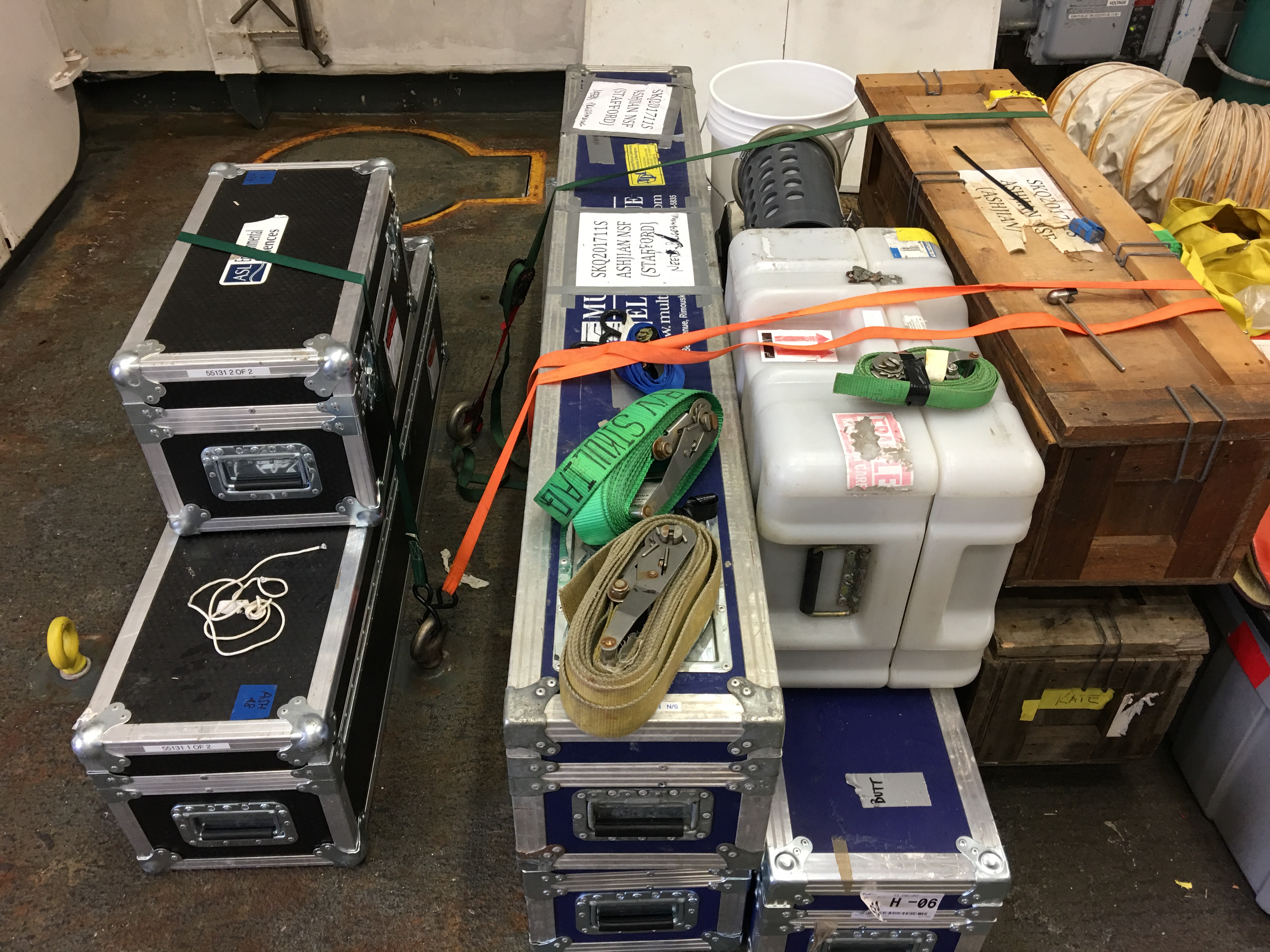 Science gear is strapped to the deck in preparation for upcoming heavy weather. Aboard the R/V Sikuliaq in the Beaufort Sea.