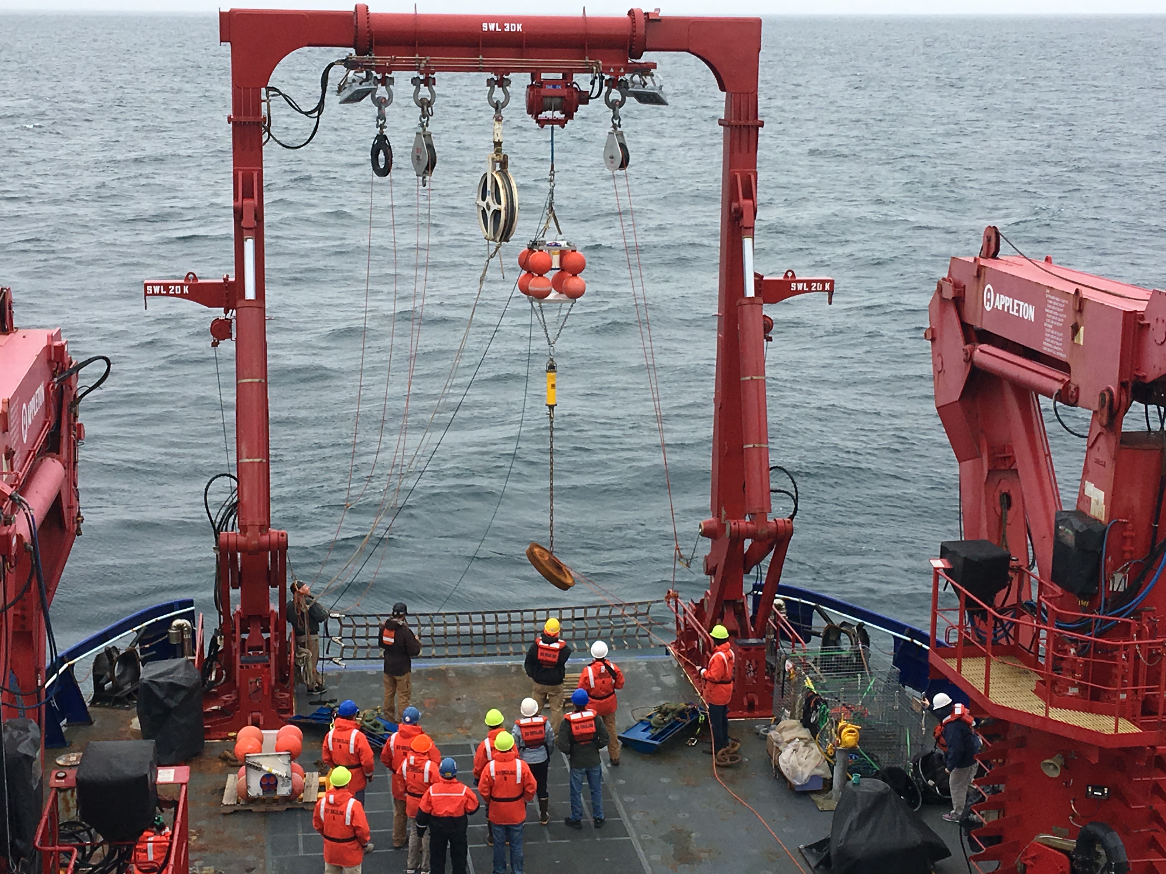 The crew prepares to set an oceanographic mooring on the main deck. Aboard the R/V Sikuliaq in the Beaufort Sea.
