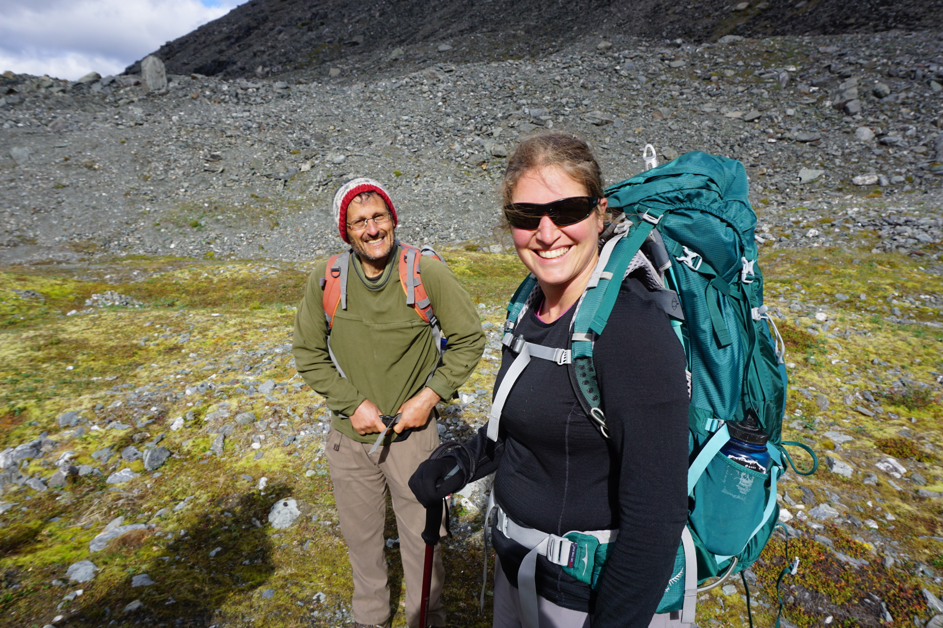 Rebecca Harris and Darrell Kaufman hike to a field site near Chamberlin Glacier in the Brooks Range, Arctic National Wildlife Refuge, Alaska.