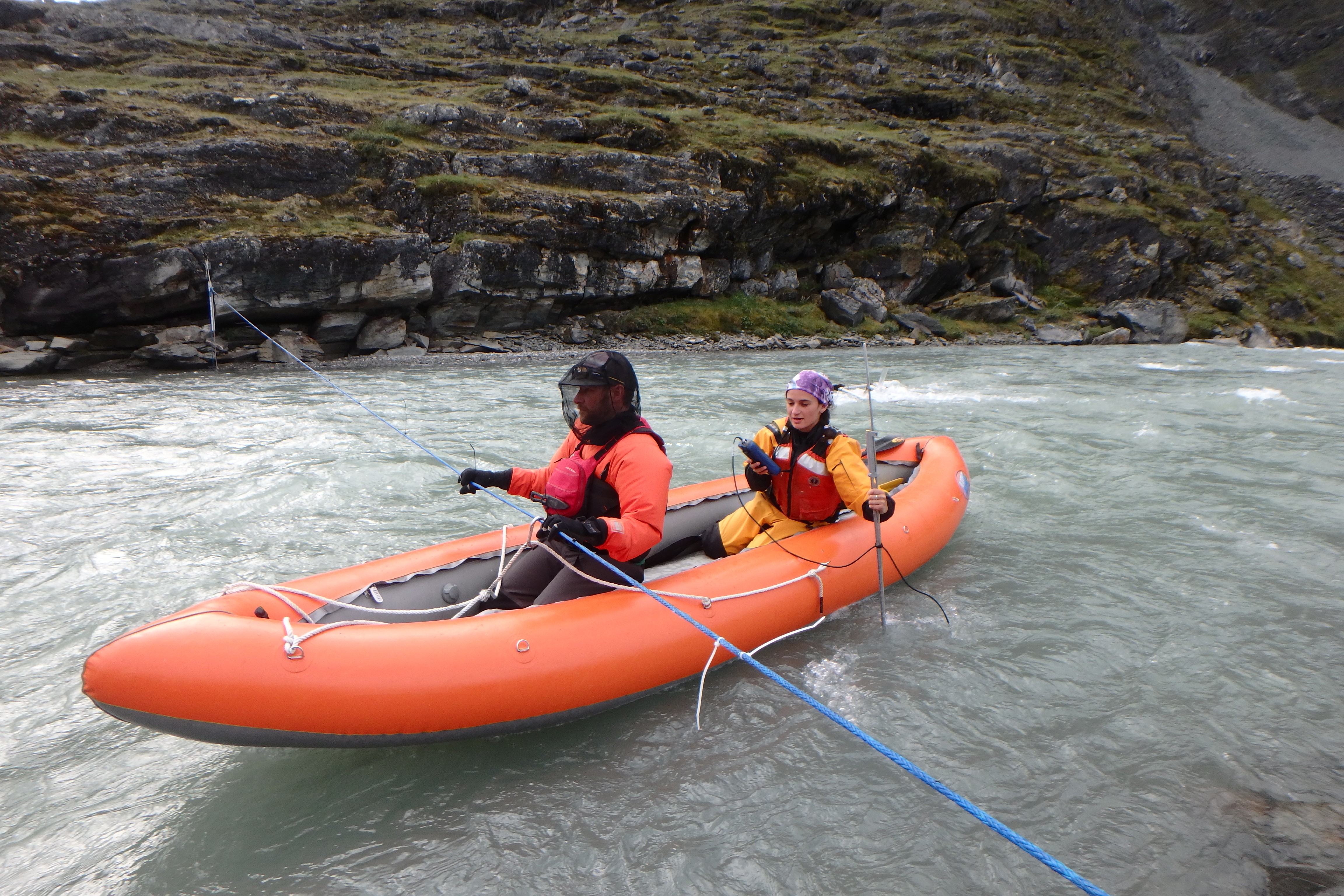Chris Benson and Ellie Broadman attempt a discharge measurement at high flow on Carnivore Creek. Brooks Range, Arctic National Wildlife Refuge, Alaska.