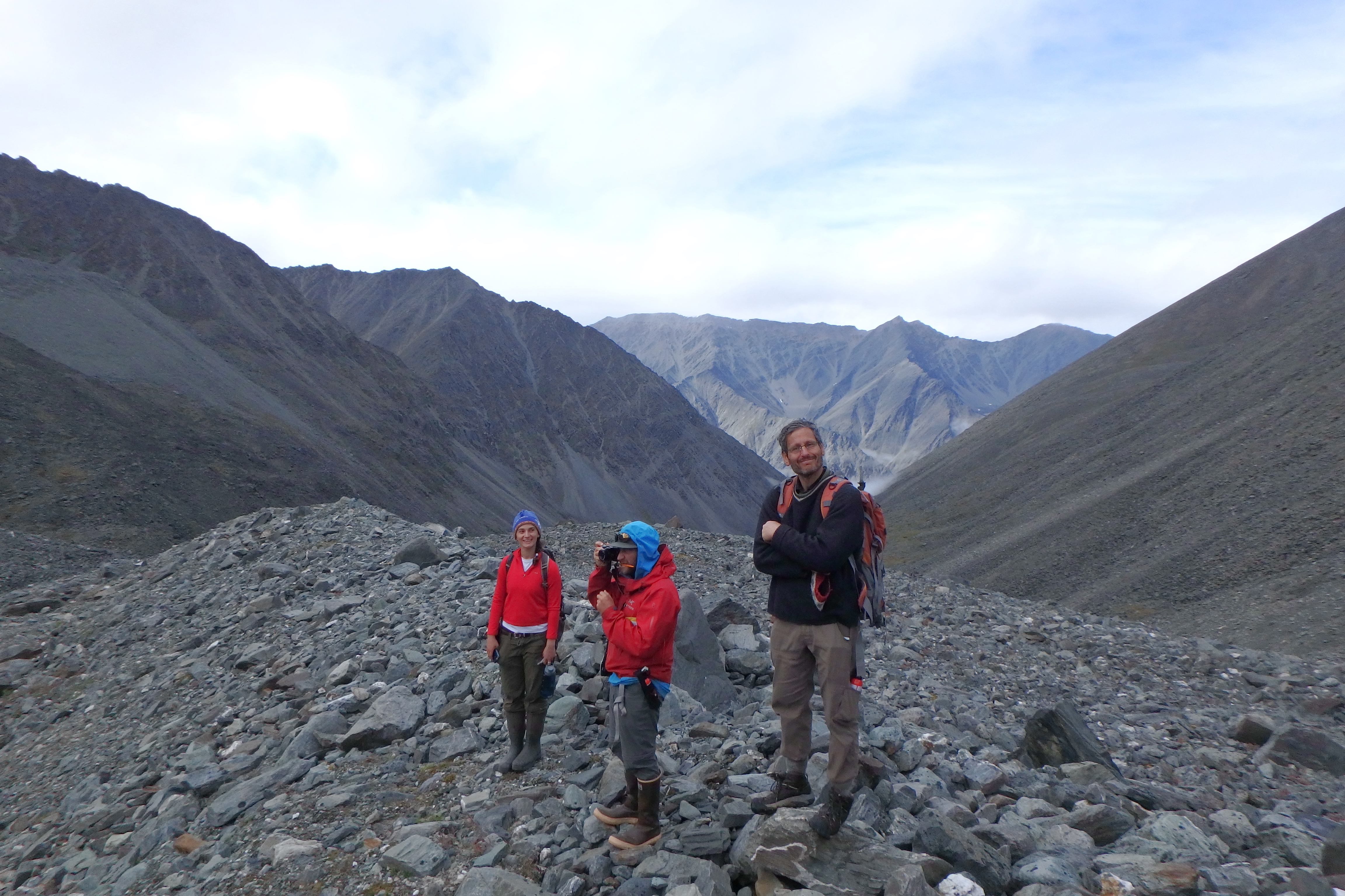 The team stands on a high moraine in a glaciated tribuary of Carnivore Creek. Brooks Range, Arctic National Wildlife Refuge, Alaska.