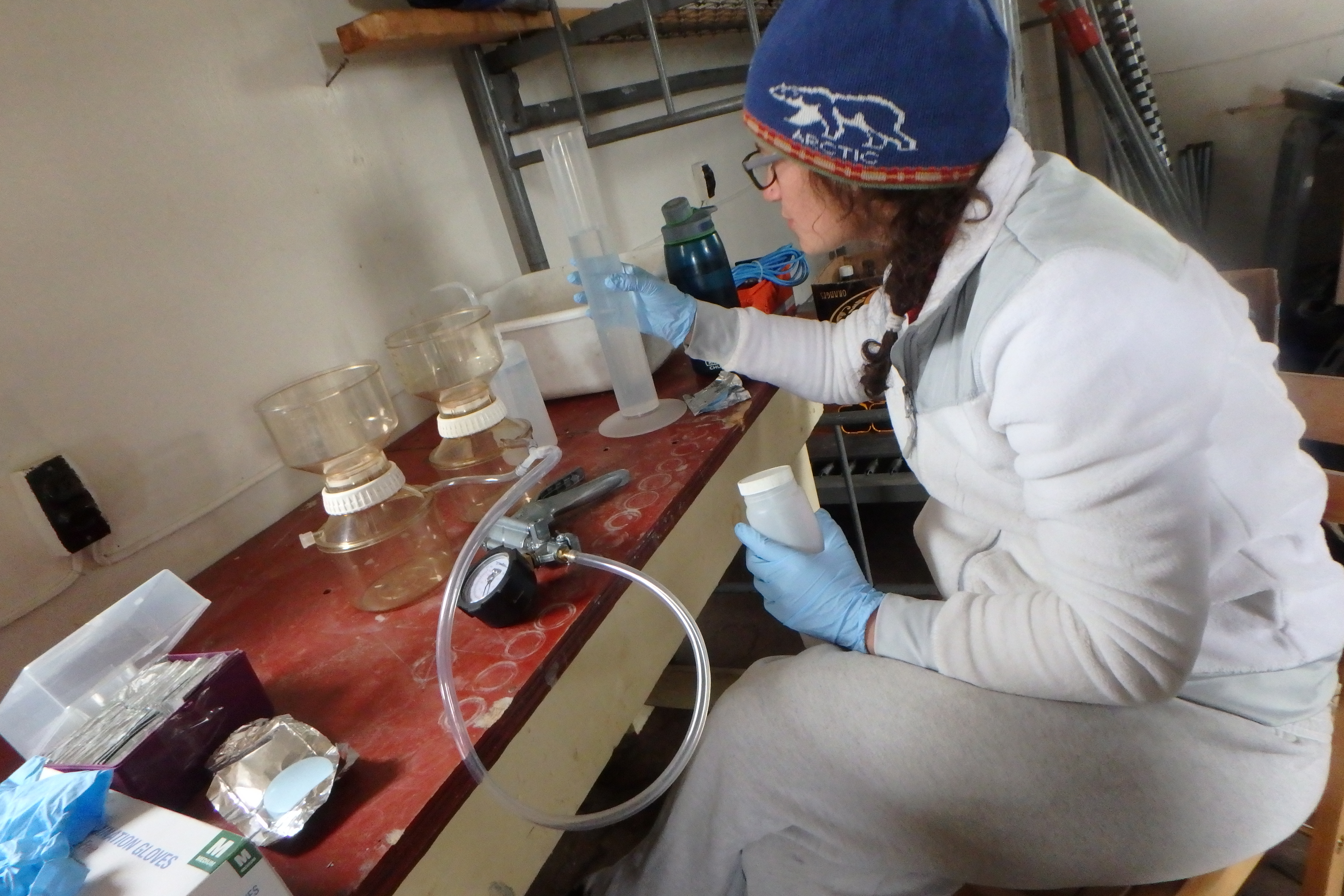 Ellie Broadman filters sediment in the field laboratory at Lake Peters. Arctic National Wildlife Refuge, Alaska.