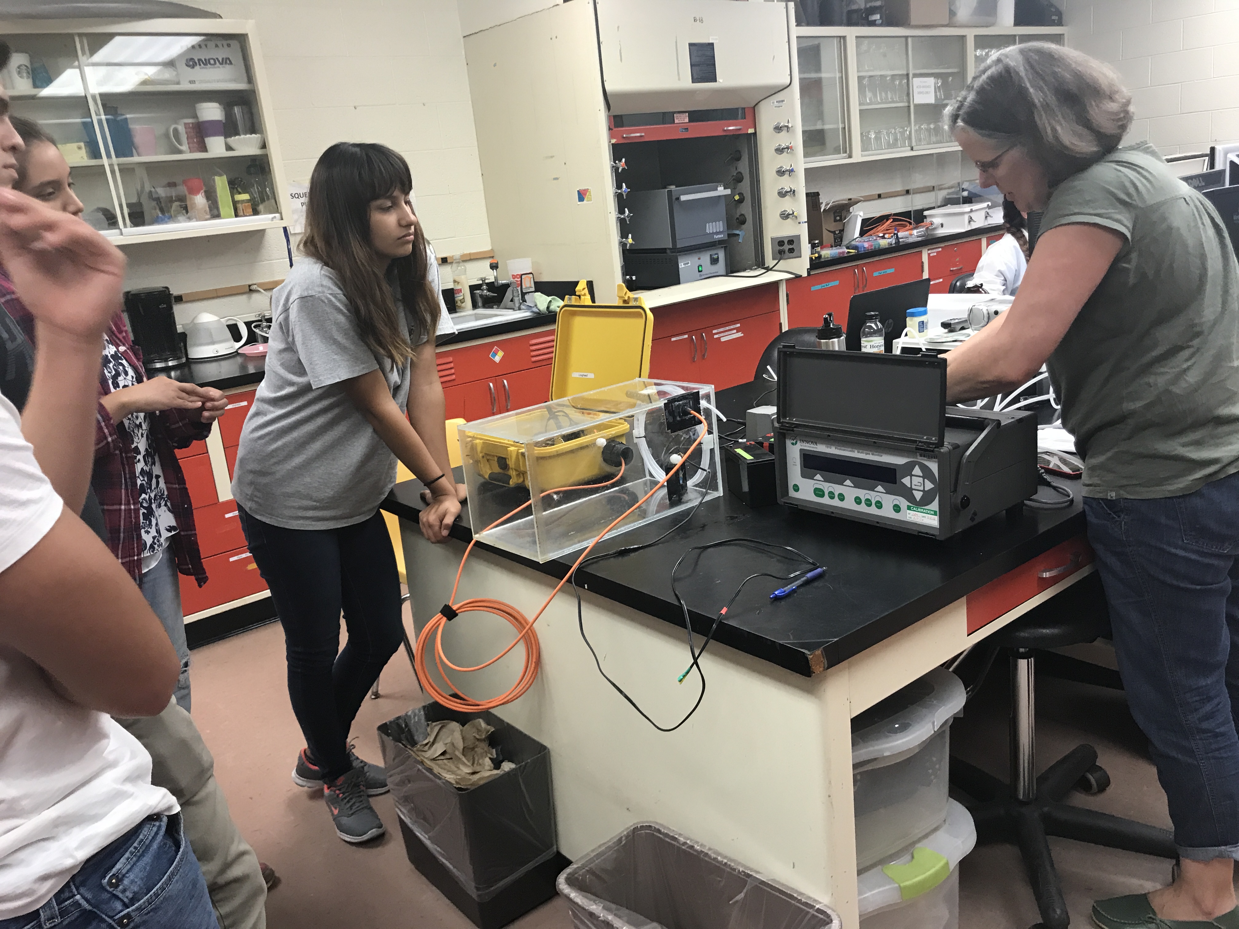 Undergraduate research assistant Viridiana Orona watchs as Dr. Vanessa Lougheed calibrates a carbon gas chamber before taking it to Alaska to be used in the field. University of Texas at El Paso Aquatic Ecology Lab.