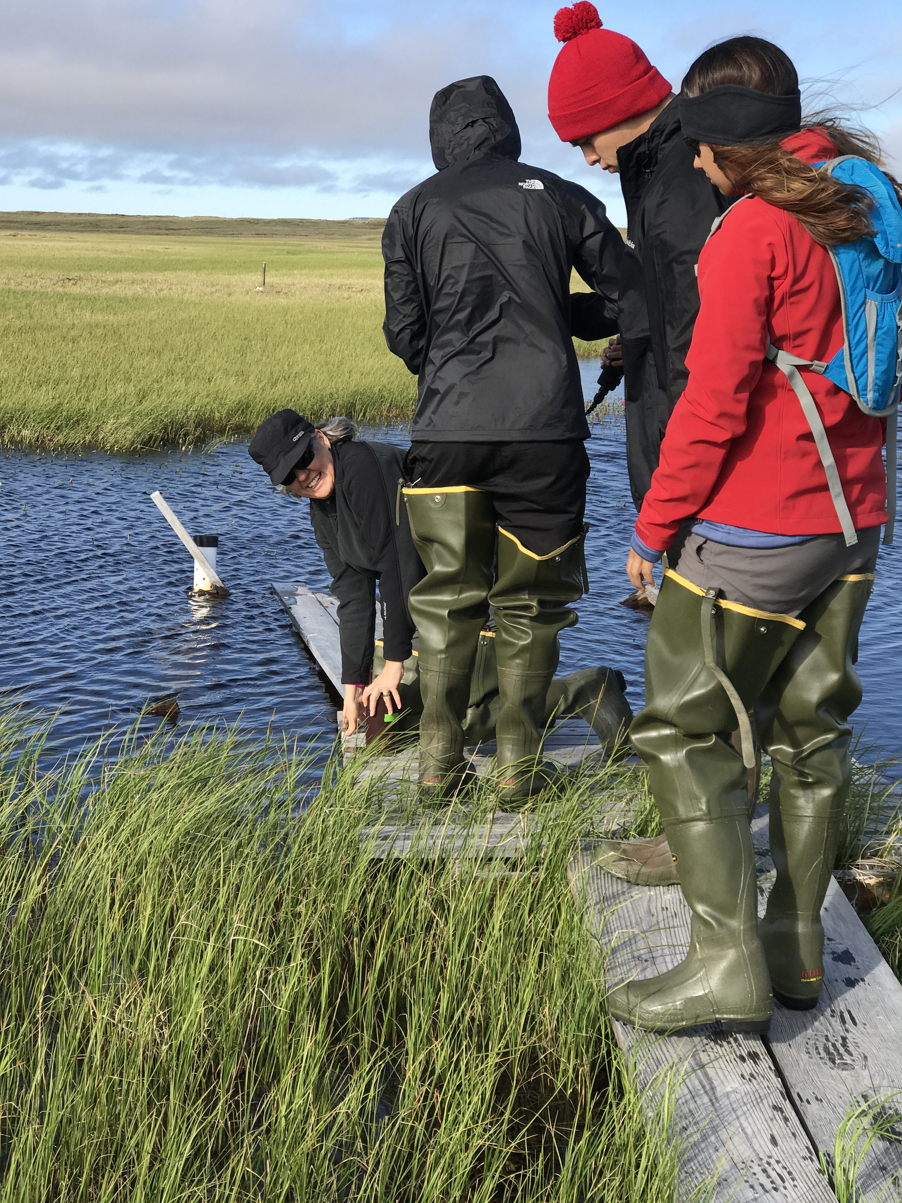 Dr. Vanessa Lougheed demonstrates where to collect the samples from the International Biological Program (IBP) pond. Utqiagvik, Alaska.