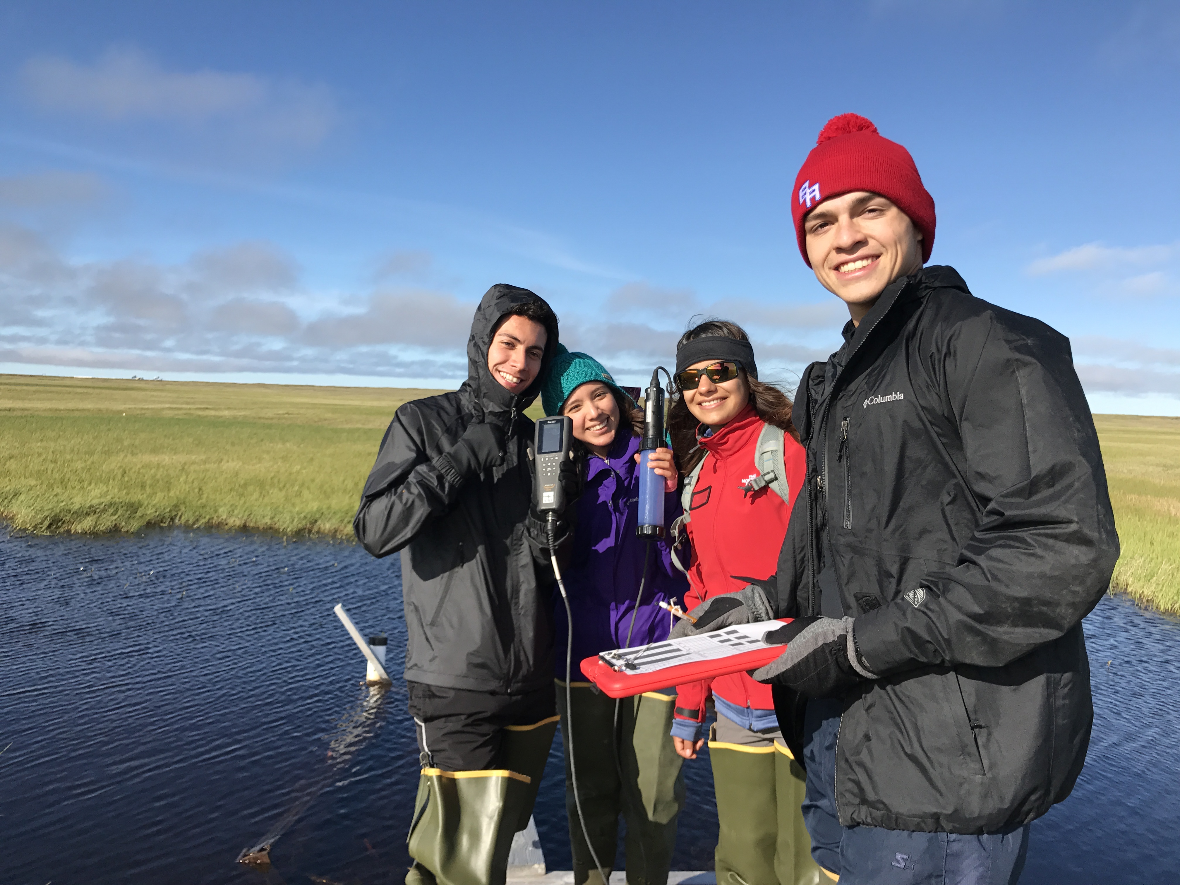 The aquatic ecology team (left to right): Luis Del Val. Rocio Ronquillo, Viridiana Orona, and Fabian Uribarri. Utqiagvik, Alaska.
