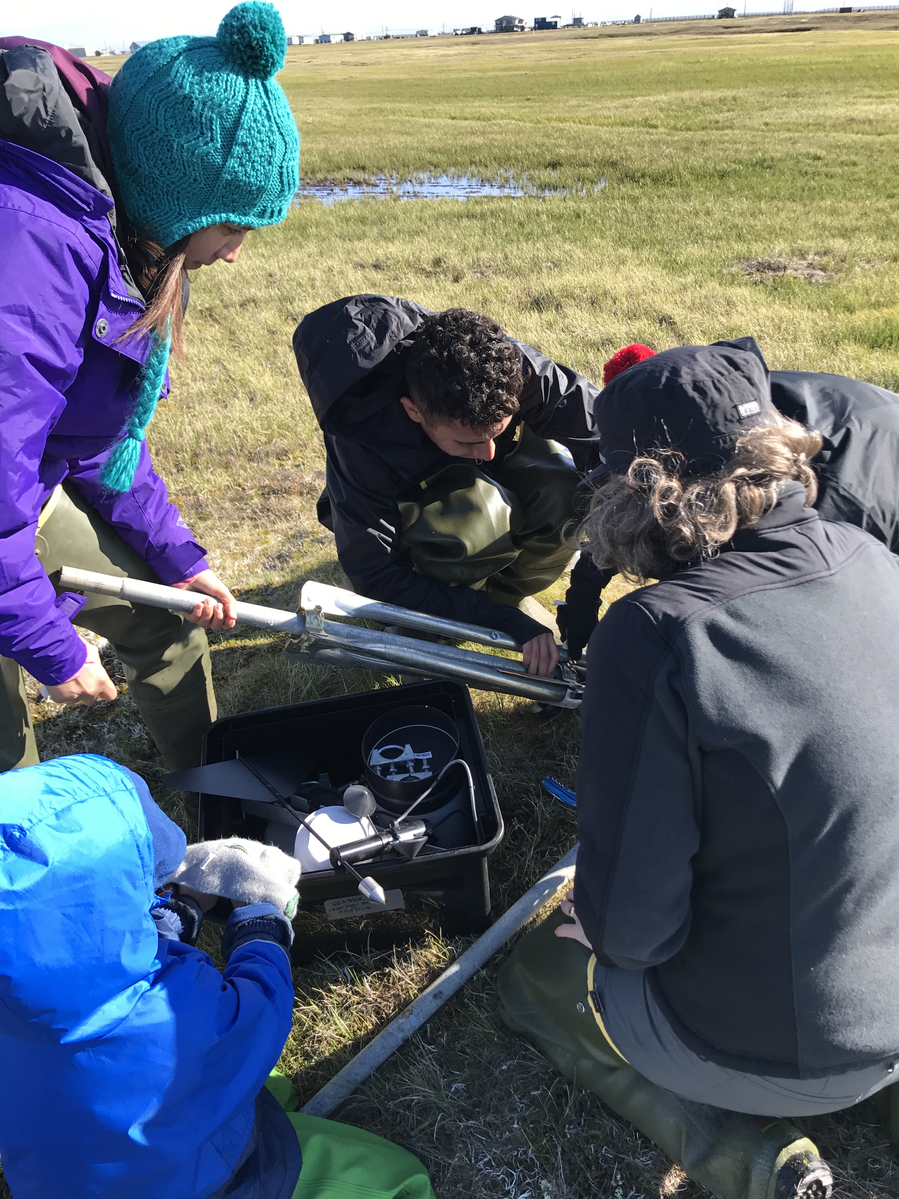 The team sets up a weather station to log the weather data from the sampling site. Utqiagvik, Alaska.