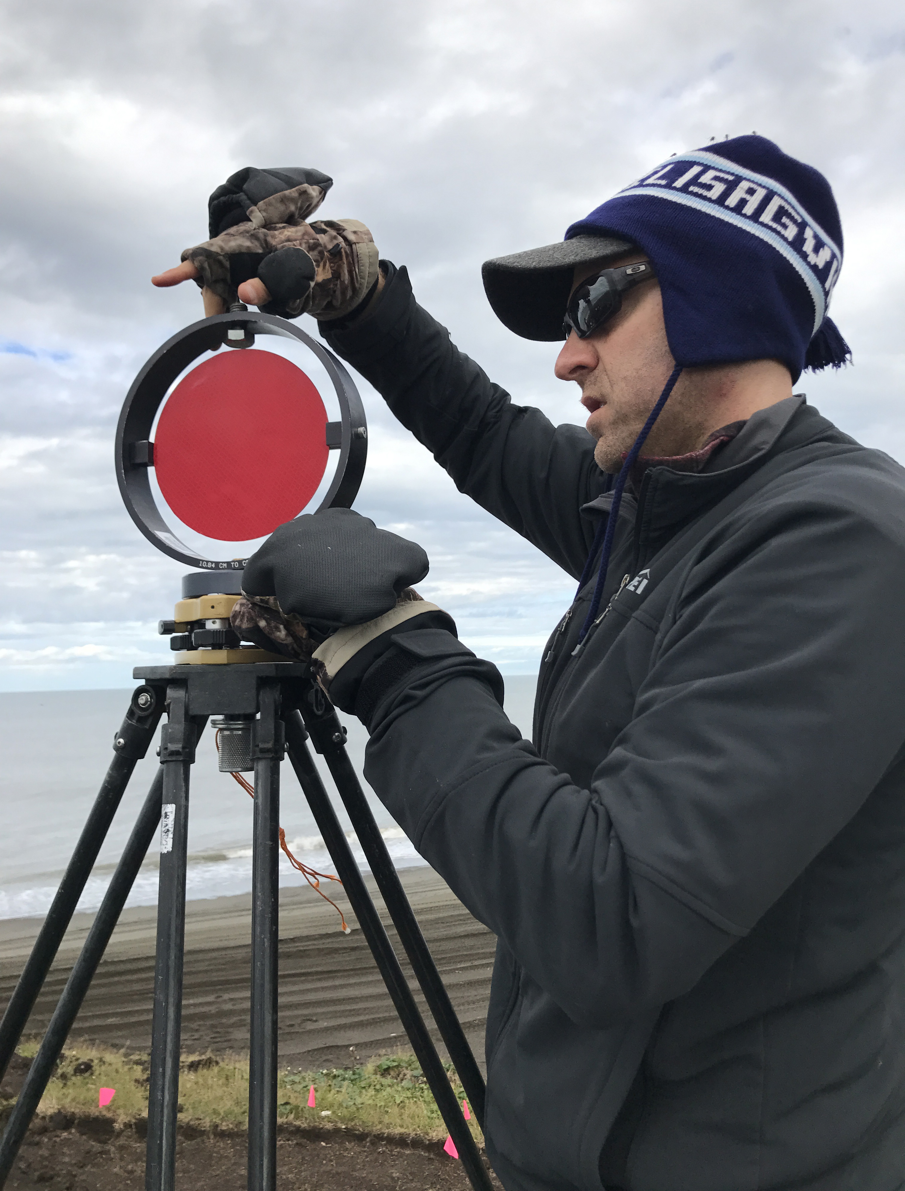 University of Texas at El Paso (UTEP) grad student, Ryan Cody, sets up the tripod and reflectors for the LIDAR. Near Walakpa Beach in Utqiagvik, Alaska.