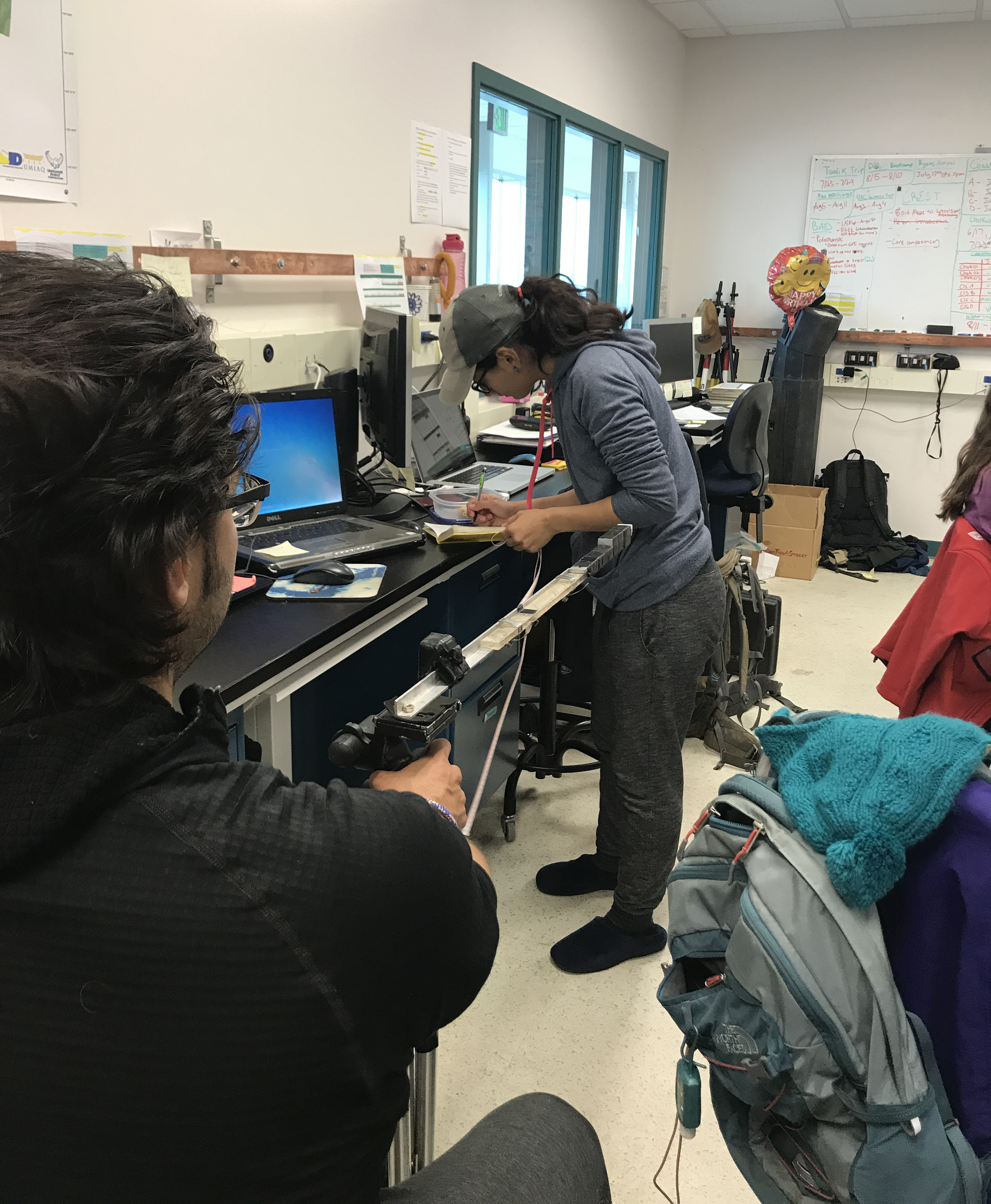 University of Texas at El Paso (UTEP) grad student, Mariana Orejel, and post-doc student Sergio Vargas, make sure the data is correct. Barrow Arctic Research Center (BARC) in Utqiagvik, Alaska.