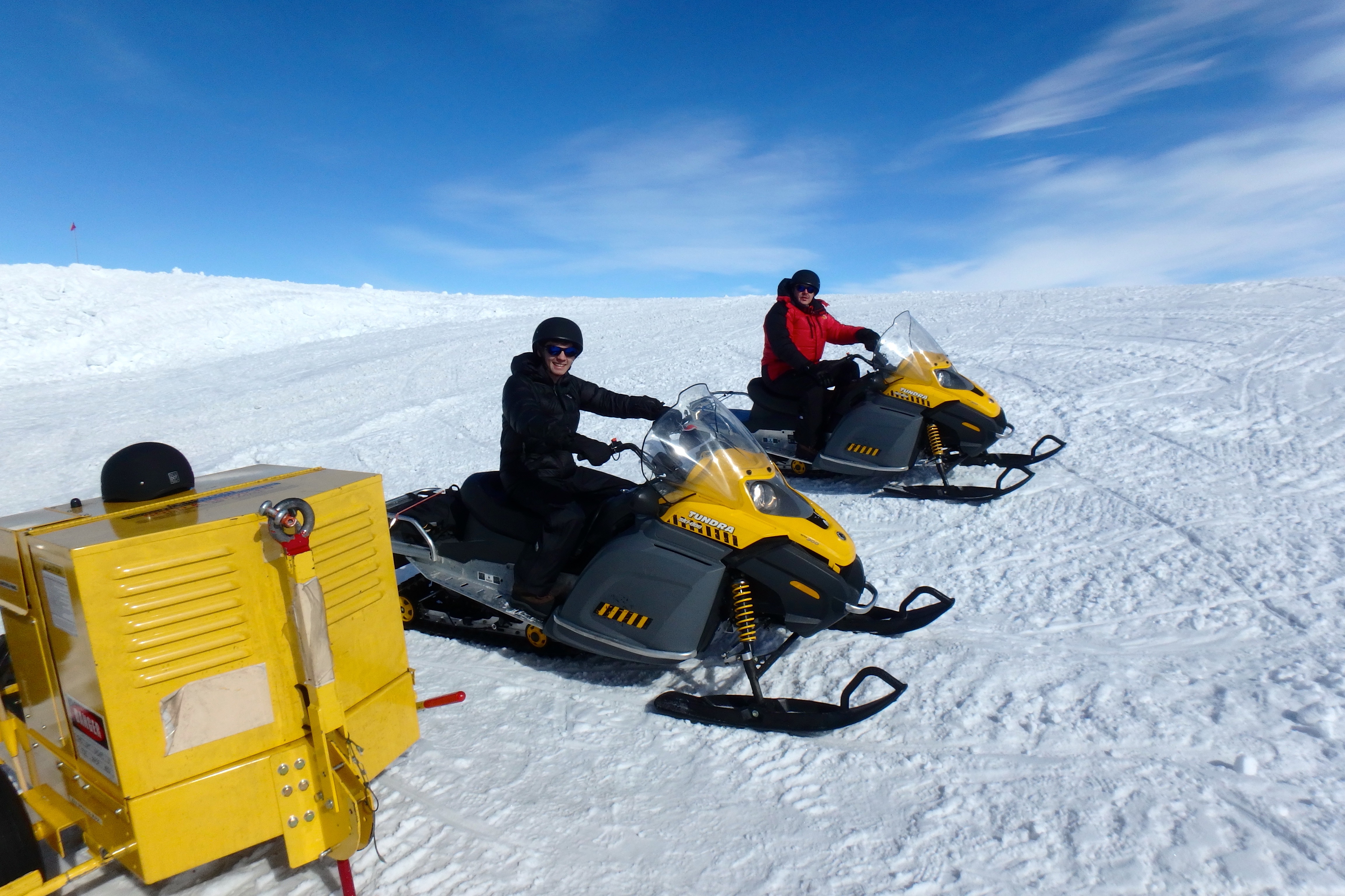 Researchers Ian Baker and Eric Wagner are about to take a test ride as part of their snowmobile training. Summit Station, Greenland.