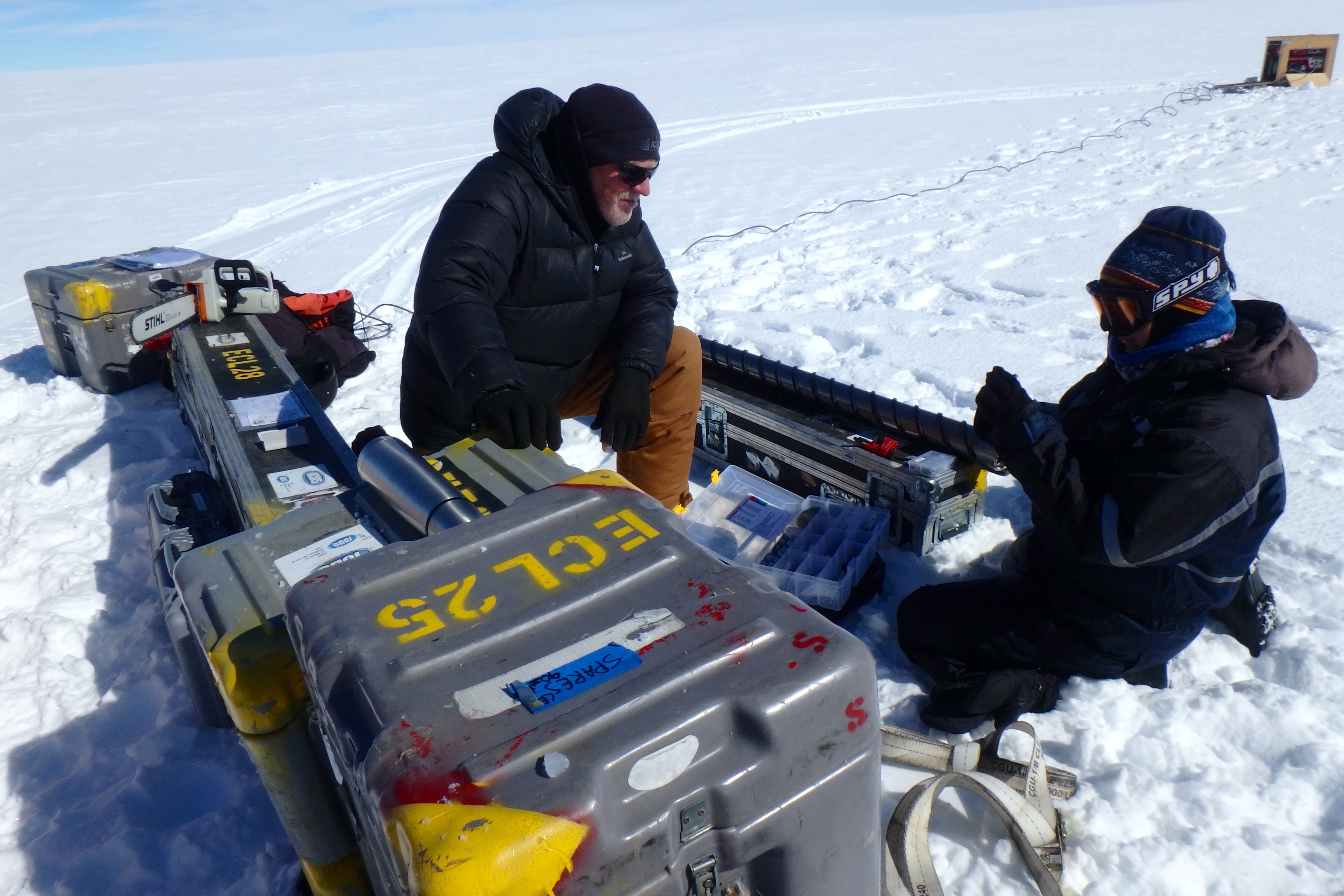 Drillers Mike Jayred and Elizabeth Morton attach the drilling head to the drill in advance of drilling for core samples. Near Summit Station, Greenland.