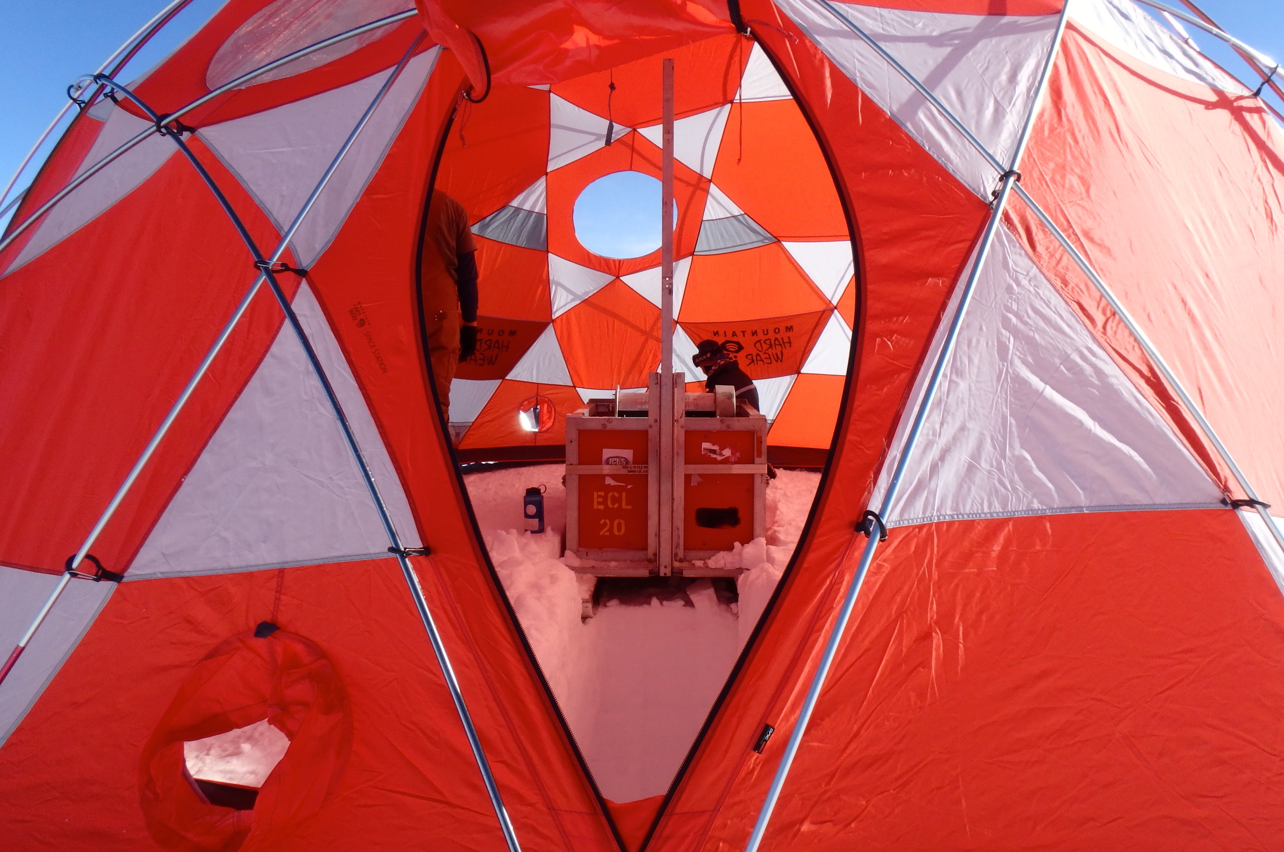The drill can be seen through the door of the tent that has been erected over it. Near Summit Station, Greenland.