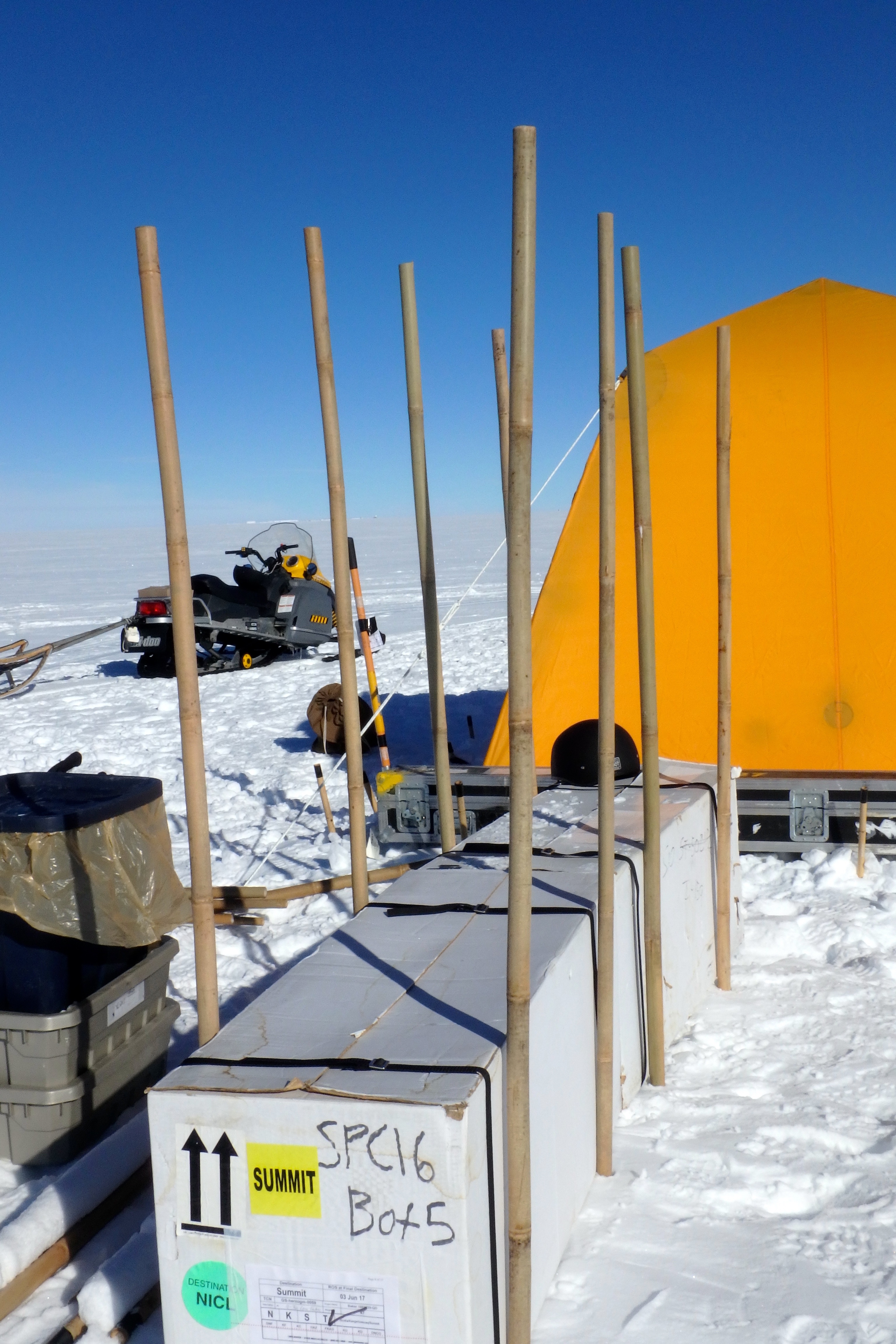 These boxes will hold the ice core samples. The bamboo stakes are to keep them from blowing away in the wind. Near Summit Station, Greenland.