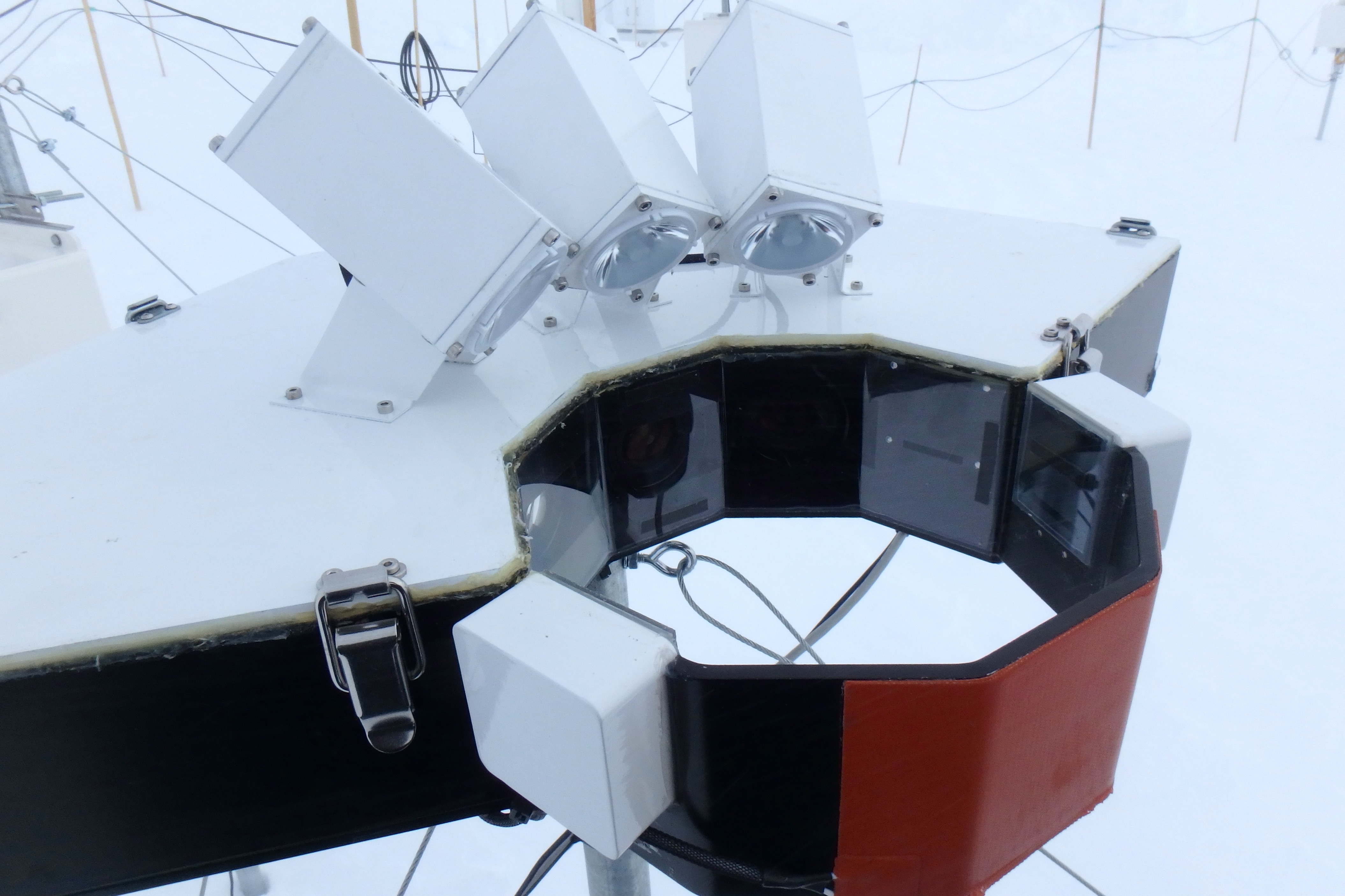This sensor uses lights and cameras to photograph and record snowflakes that fall through it. Summit Station, Greenland.