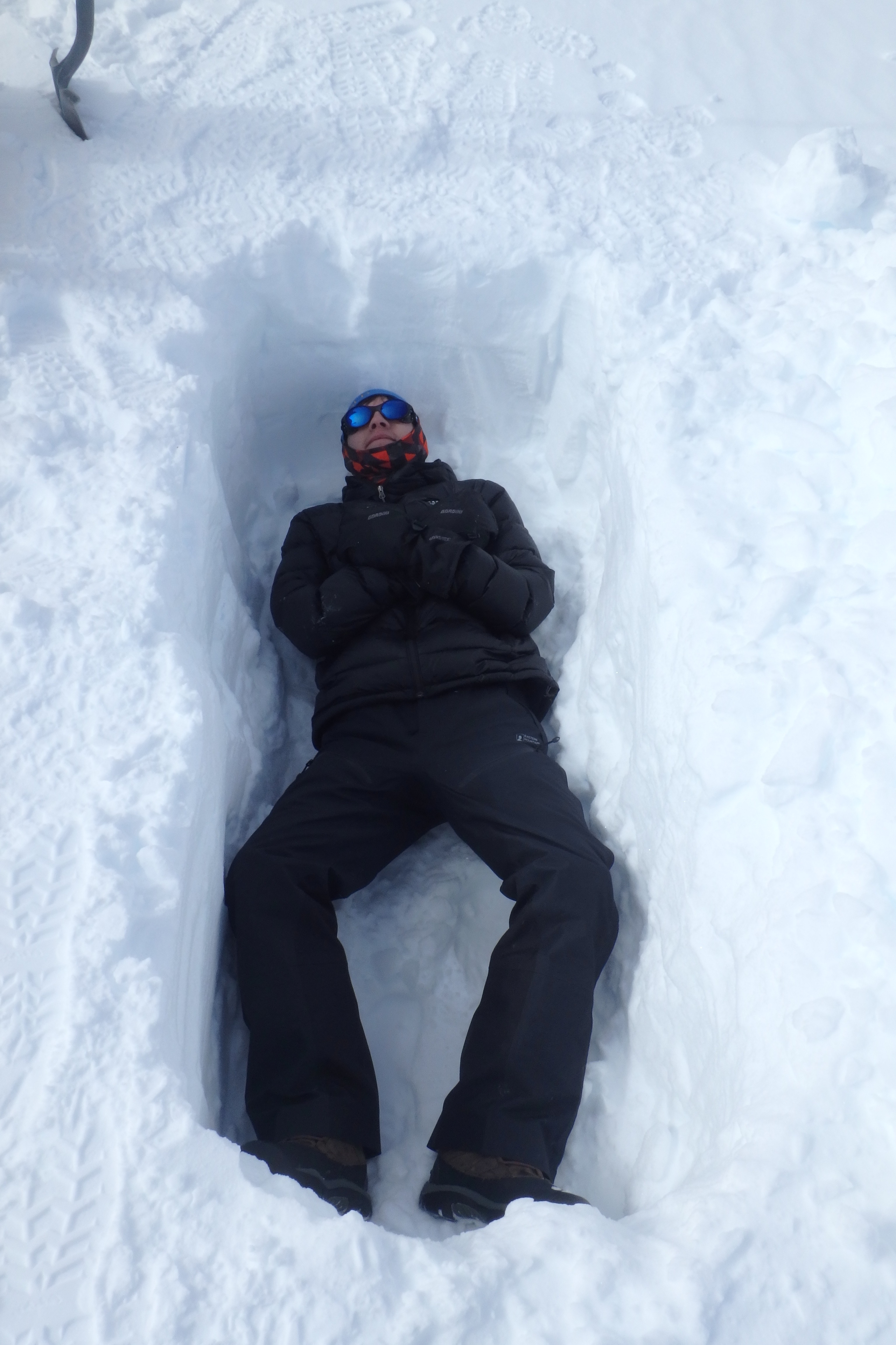 This snow pit was dug to keep ice core samples cold enough while awaiting transport back to Summit Station. Researcher Eric Wagner has a little fun by laying in the pit. At the drill site near Summit Station, Greenland.