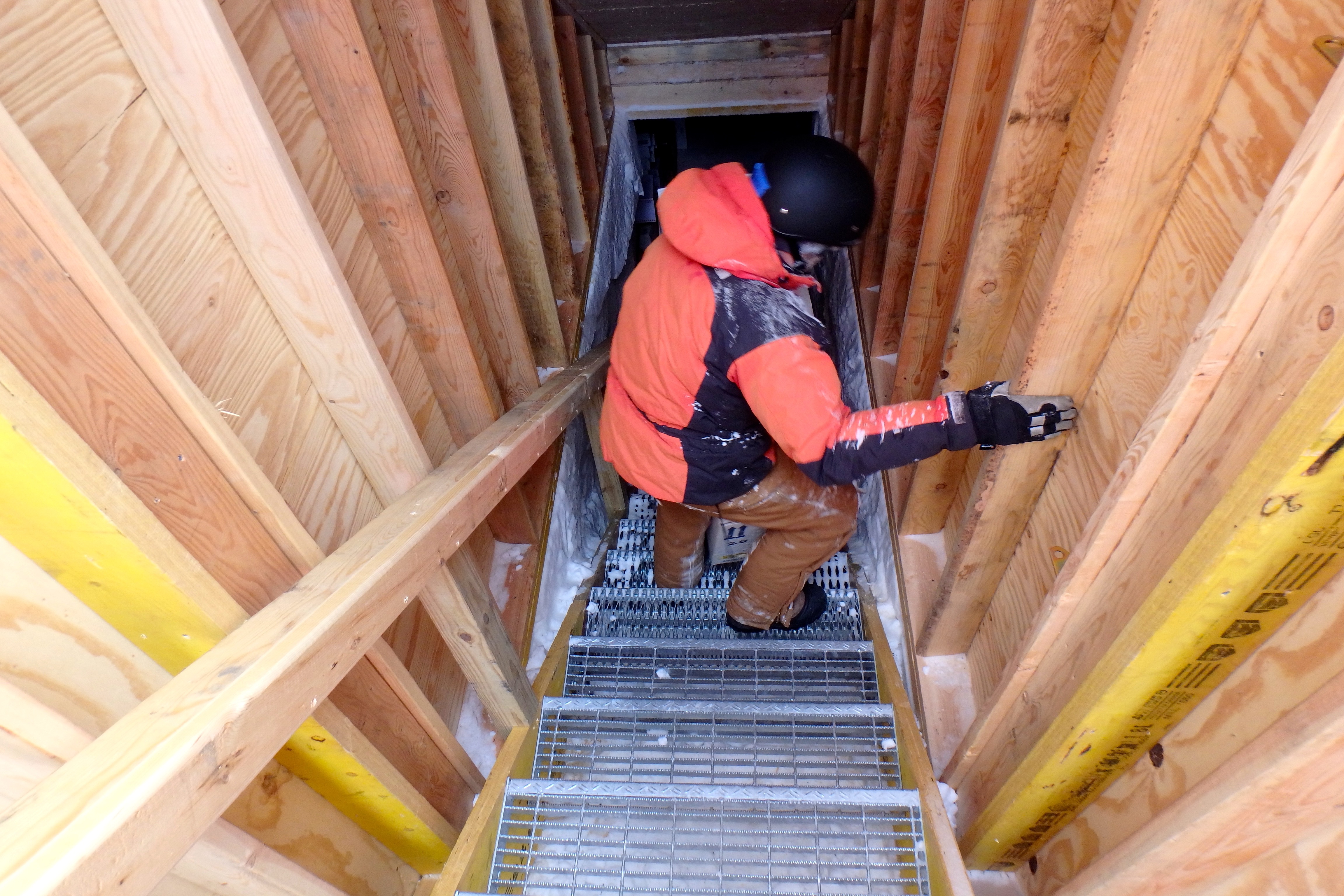 Driller Mike Jayred helps carry ice core samples into the underground storage room where it is cold enough to store the ice core samples. Summit Station, Greenland.