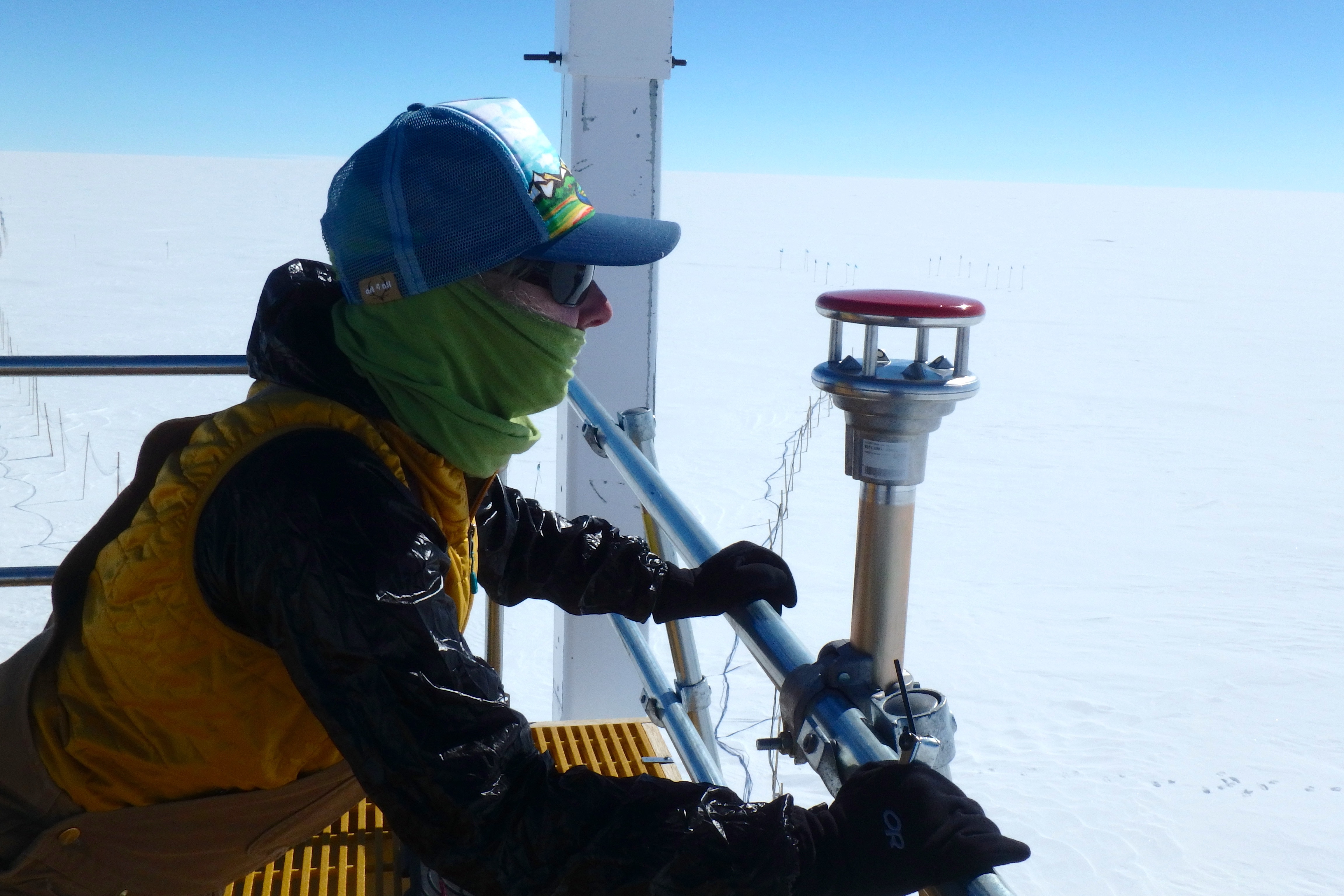 Science technician Heather McIntyre installs a doppler anemometer. Summit Station, Greenland.