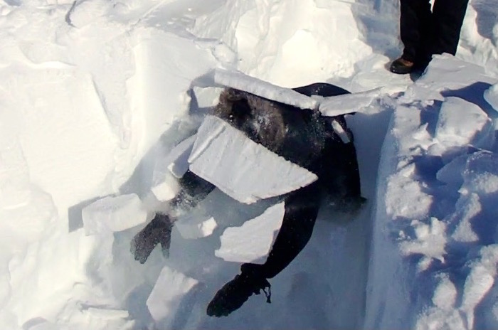 Steve Kirsche gets the honor of breaking through the thin wall of the snow pit. Near Summit Station, Greenland.